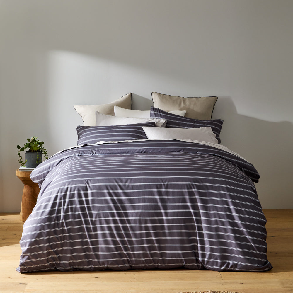 Elevate any bedroom with the Adorn Living® Alfie Quilt Cover Set. Our classic stripe design in timeless charcoal grey and white. Perfect for guest bedrooms and unisex spaces, this versatile set suits every home. Crafted from soft microfibre and machine-washable for effortless care. Pair with complementary MyHouse® bed sheets, pillowcases, cushions, and throws for complete coordination. Available in Double to King sizes Shop MyHouse® for more quilt cover sets, bed sheets, bedding, and home décor.