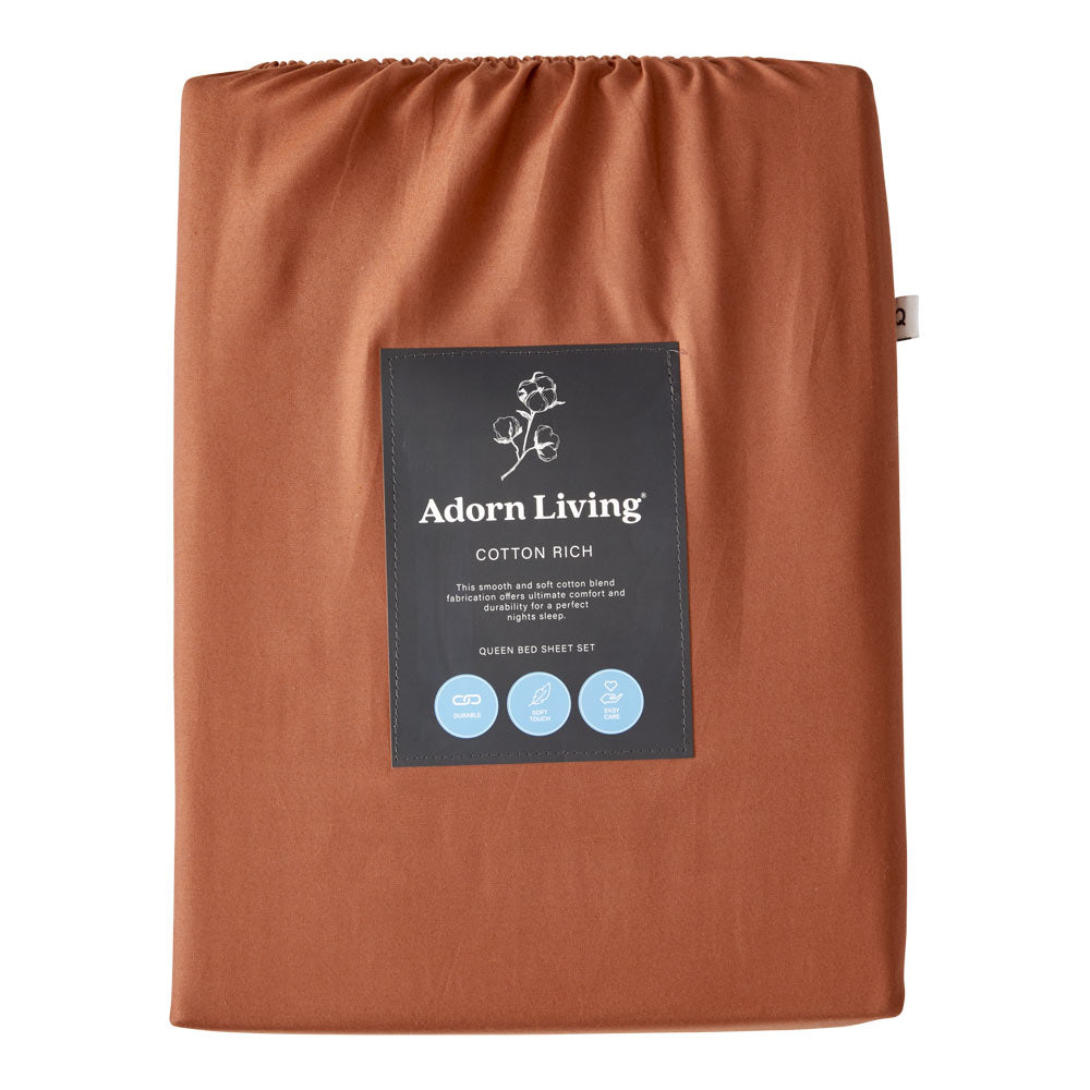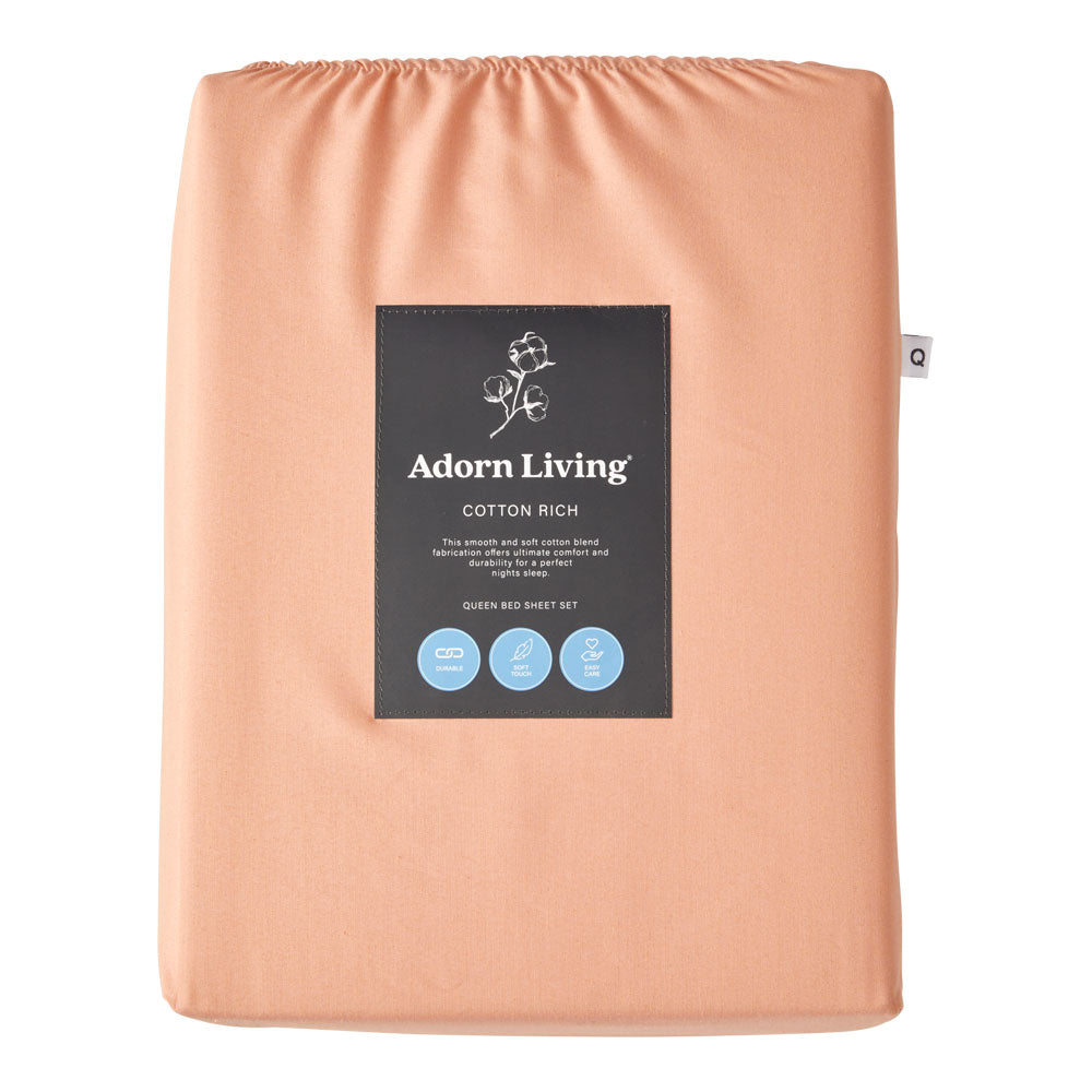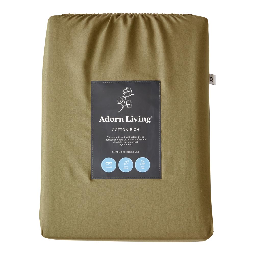 Discover everyday luxury with the Adorn Living® Cotton Rich Sheet Set. Made from a cosy blend of 60% cotton and 40% polyester, these sheets redefine softness, offering a smooth touch that feels like a dream. Designed for durability and easy care, they promise a perfect night's sleep without the fuss; simply toss them in the washing machine for effortless cleaning. With various sizes available, these sheets invite you to personalise your space. Choose from classic white, winter sky blue, army green, dusty apricot, or hazel to effortlessly transform your bedroom into a stylish and serene retreat. Embrace comfort with the Adorn Living® Sheet Set - your everyday indulgence in relaxation.
