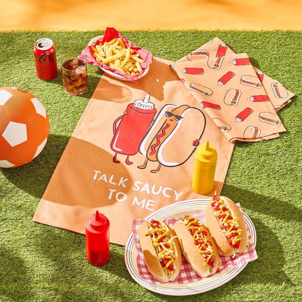 The cheeky Adorn Living® Talk Saucy Apron in bright, summertime orange brings humour to any kitchen! Perfect for gifting to your favourite\ home chef or wearing while preparing festive feasts for loved ones. Made from lightweight yet durable cotton for long-lasting use. The playful design features a sassy hot dog with witty text on bright red straps. Pair with our set of 2 matching tea towels for a fun kitchen this holiday season! Shop MyHouse® for more festive kitchen accessories and festive home decor that’s perfect for your home this year.