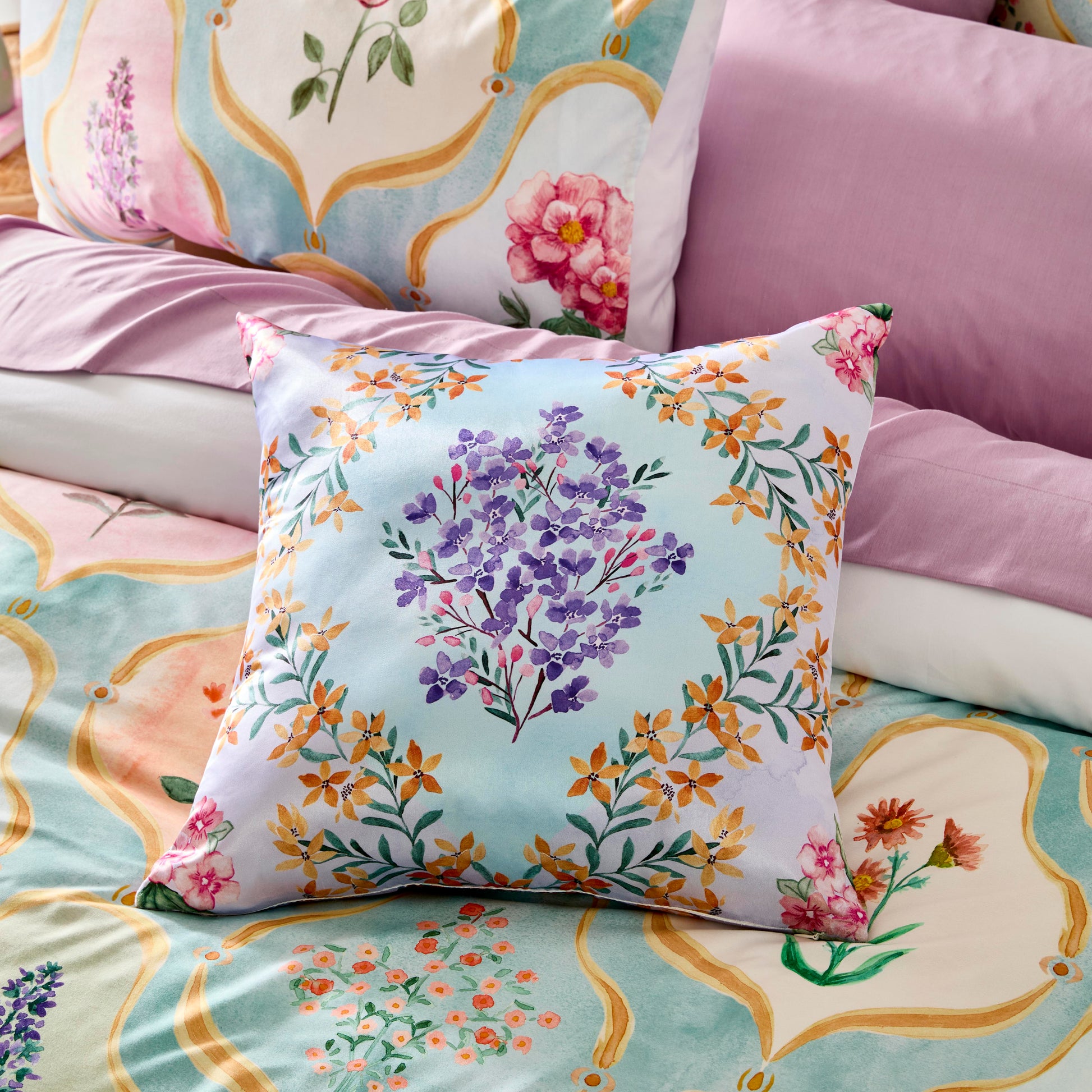 The Adorn Living® Vaeda Cushion showcases a charming painterly floral design with vibrant purple blooms surrounded by delicate orange and pink botanicals on a soft blue background. Crafted from luxurious satin and durable polyester, this decorative cushion brings elegant charm to any bedroom. The Vaeda cushion perfectly coordinates with the matching Vaeda quilt cover set for a beautifully cohesive look. Shop Adorn Living® for more bed linen including quilt covers, bed sheets, pillowcases, throws, and blankets.