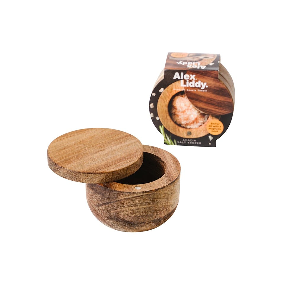 Keep your cooking essentials close at hand with the Alex Liddy® Acacia Salt Keeper. Your cooking essentials are never too far away with the Alex Liddy® Acacia Salt Keeper. Conveniently store your salt or other spices for easy access as you cook, so you never have to go hunting in the back of the pantry. The lid operates on a swivel for smooth access, with a magnetic latch that stays secure at any angle. This salt keeper is made of a beautiful native acacia wood, highly durable while being soft to the touch. The characteristic warmth of the wood complements any kitchen setting, adding a rustic touch. Pair with other items in the Acacia range for a cosy and natural feel to your kitchenware. To best care for the wood, hand wash only with mild detergent.