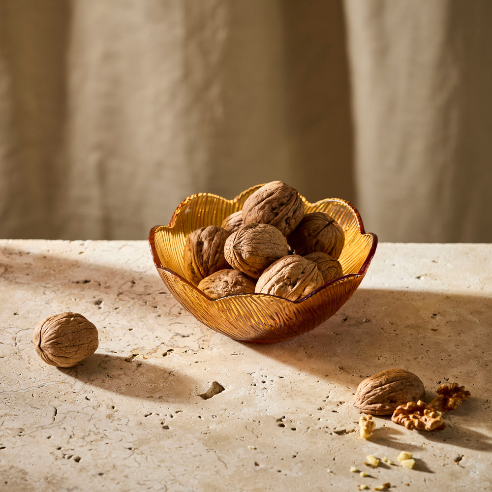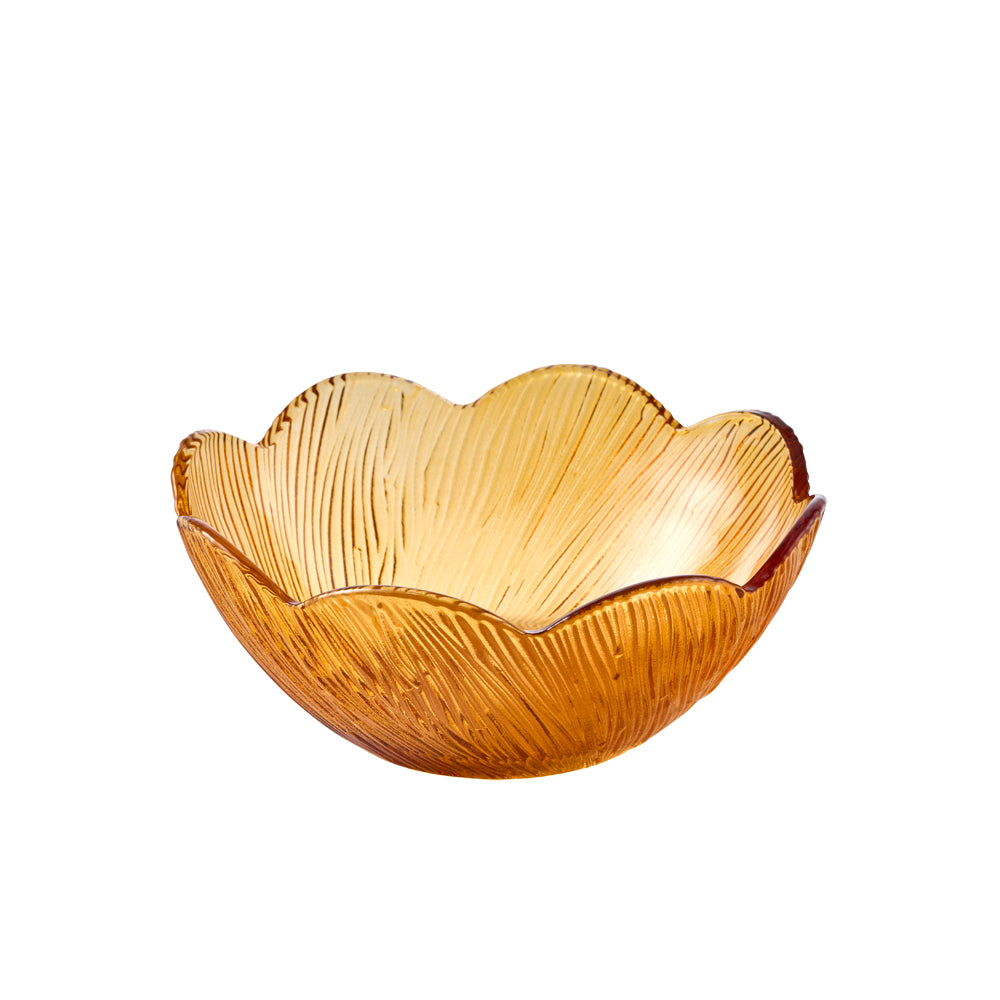 Add warmth to your table with the Alex Liddy Harley V Bowl 13.5cm. This beautiful glass bowl features an elegant flower-petal shape with intricate embossed textured detailing in warm amber tones. Perfect for serving nuts, sweets, dips, or side dishes, the delicate scalloped edges add artisan charm. An ideal gift for home chefs who appreciate decorative serving bowls that combine vintage-inspired elegance with everyday functionality. Shop the Harley collection by Alex Liddy for more dining and entertaining gifts she will love.