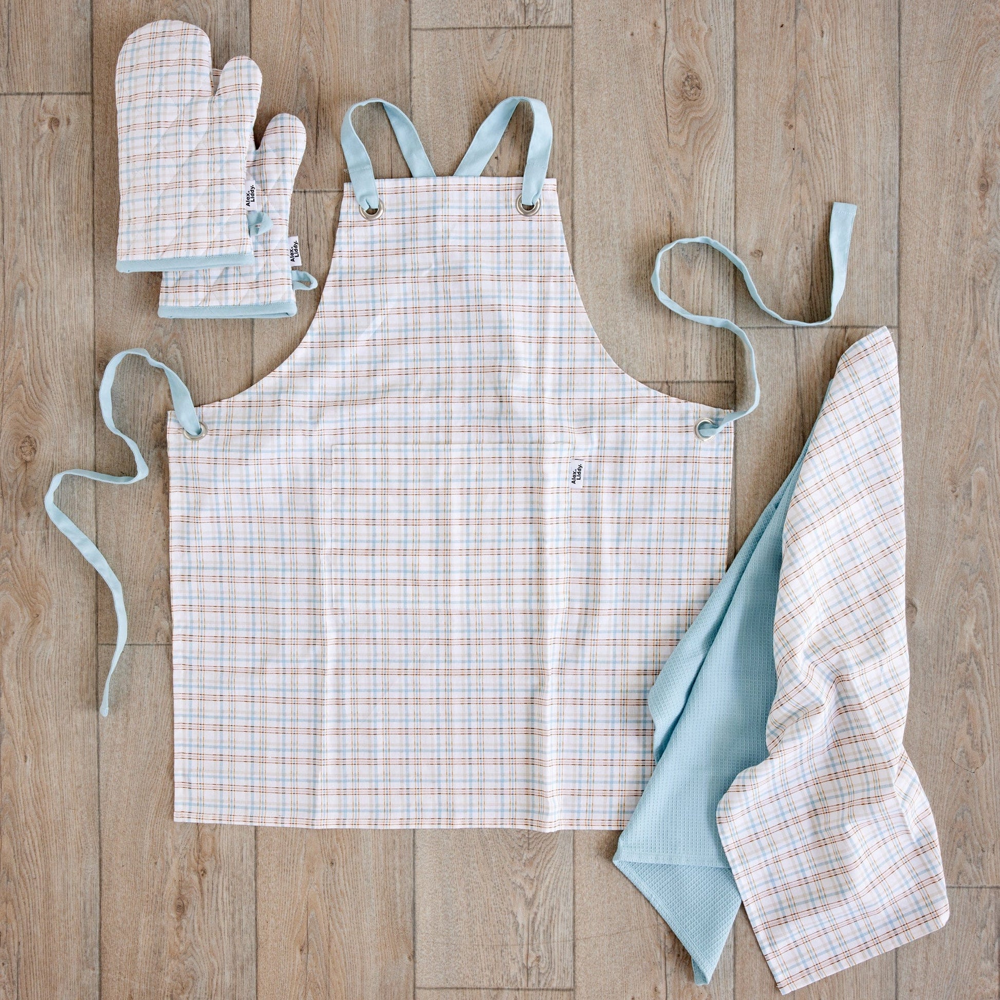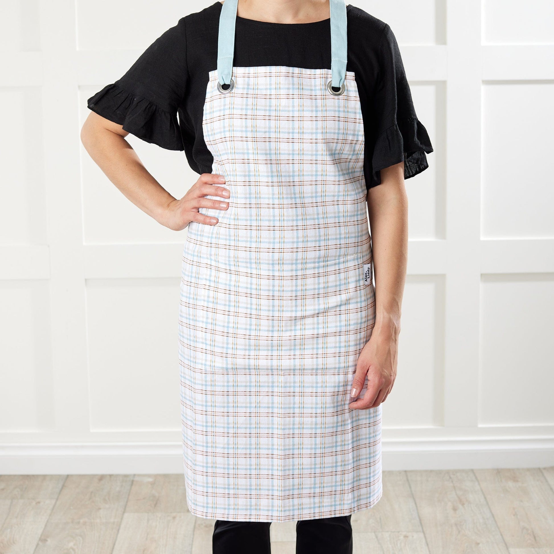 Add some style to your kitchen with the Alex Liddy® Marcia Apron. Crafted from 100% cotton, this apron boasts a sturdy, medium-weight construction that is both comfortable and protective - perfect for keeping up with the demands of a busy home cook. Showing off a cheerful brown and sky-blue plaid print on a fresh white background, the apron benefits from a convenient pocket for keeping kitchen gadgets handy or your phone nearby. Wear the MyHouse Marcia Apron to keep your clothes clean while cooking up a storm and dry when washing up the dishes. Machine washable for effortless cleaning, the apron can withstand hundreds of cycles while retaining its strength or durability for long-lasting use. Coordinate the MyHouse Marcia Apron with the matching Marcia oven mitts and tea towels for a complete set.