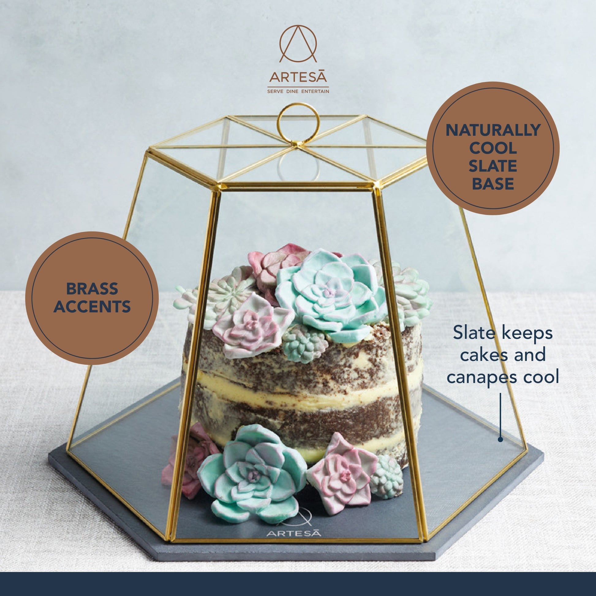 • PRESENT CAKES, CANAPES AND CHEESE IN STYLE: with Artesà's geometric glass cloche and slate board• SHINES UNDER AMBIENT LIGHTING: the hexagonal lid is finished with a glowing brass-coloured frame