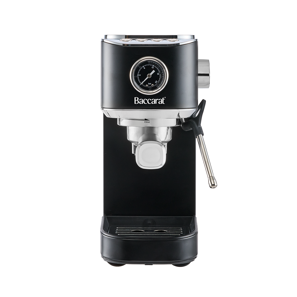 Brew barista-quality espresso at home with the Baccarat® The Espresso Pro Coffee Machine featuring professional 20 bar pressure for superior extraction. This compact espresso machine includes a precision pressure gauge milk frother, double barrel portafilter for simultaneous dual shots. Single and double espresso shot functions deliver café-quality results, while the easy-grip steam wand ensures safe, precise operation. Sleek design enables convenient storage.