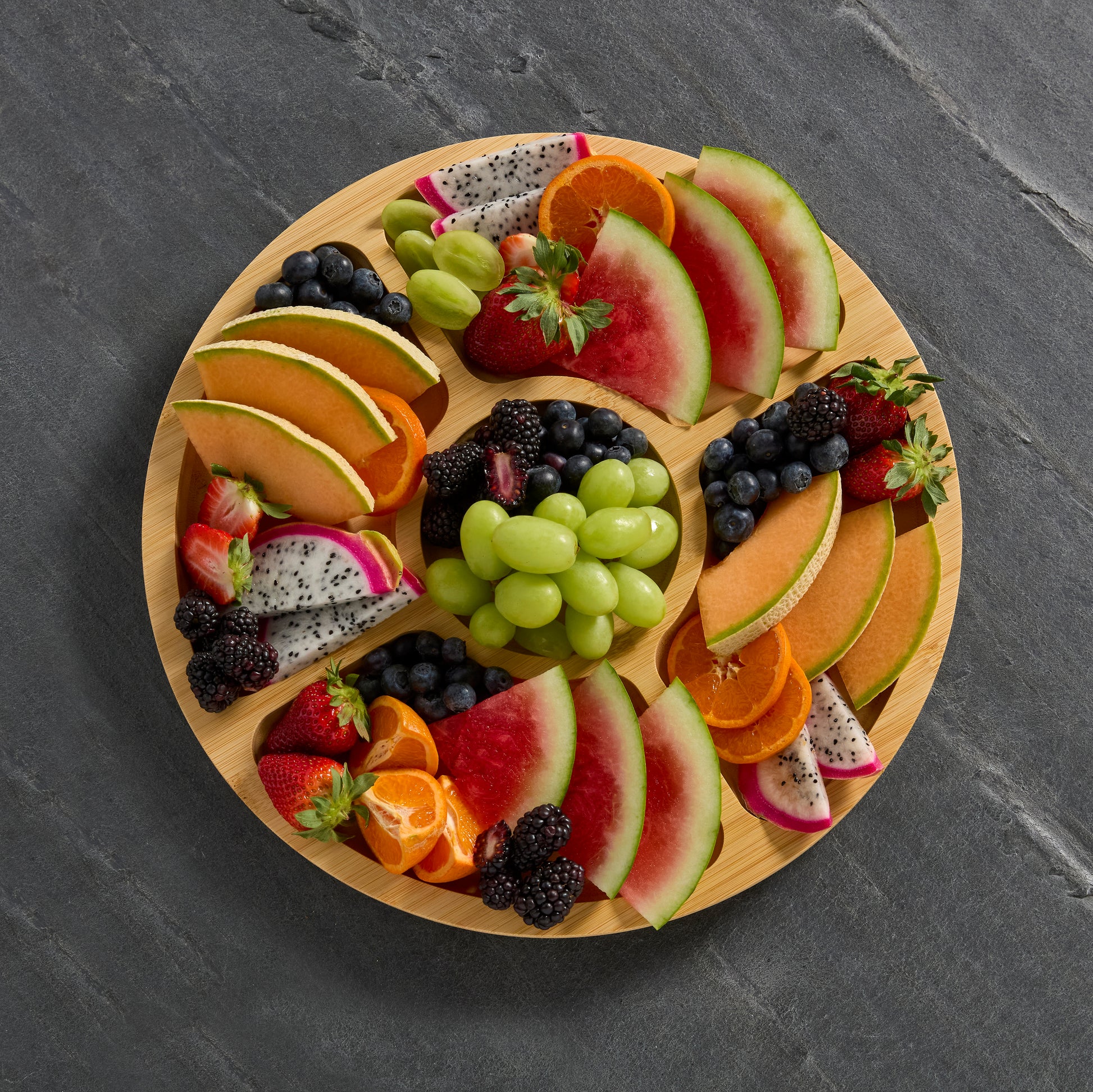 Snack time just got a major upgrade! The durable Farberware Build A Board Bamboo Round Section Board 35cmhas 5 handy compartments- a section in the centre for dips and sauces is here to take your meal prep, serving, and snacking to the next level. Whether hosting a brunch, packing a picnic, or keeping your kitchen chic, this platter keeps things fresh, tidy, and oh-so-stylish. Its sleek design also has a card insert slot, so you can easily label your creations, and the eco-friendly bamboo vibe makes it perfect for any occasion—indoors or out. So go ahead, make every meal a little e more fabulous.