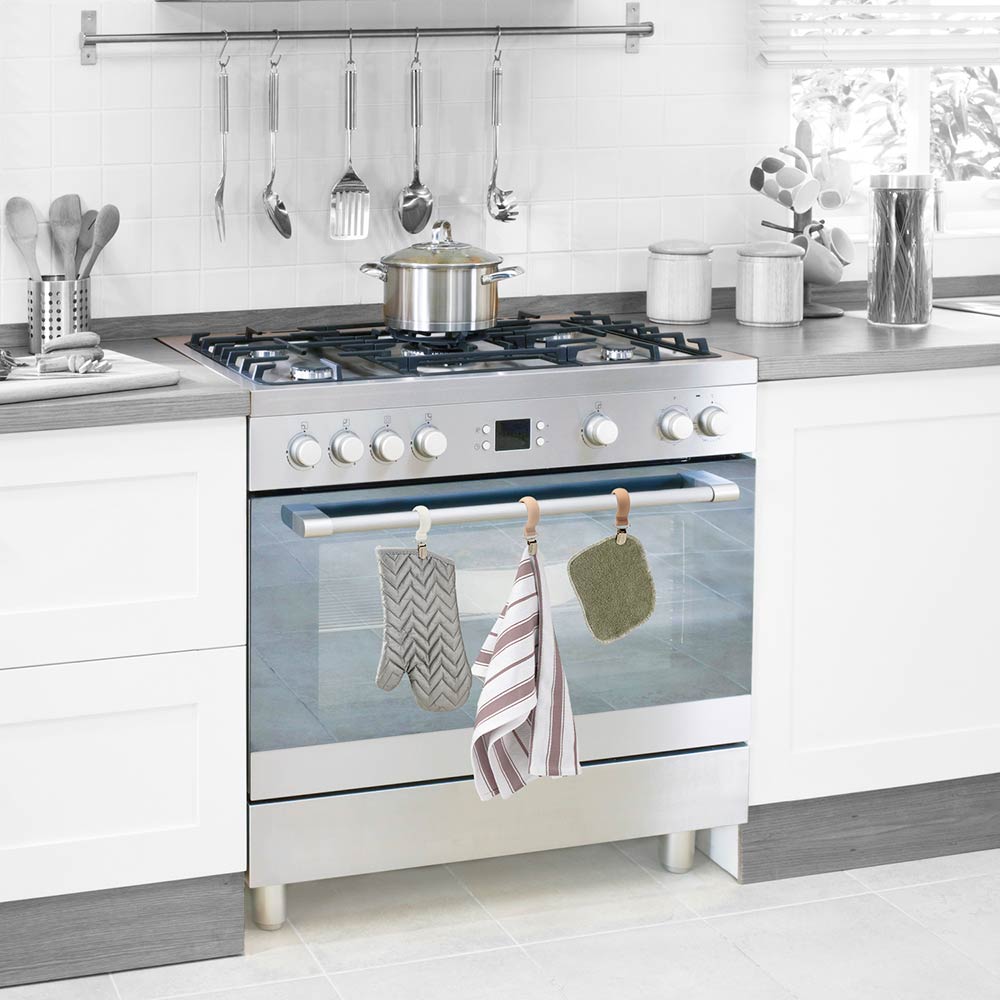 • Save kitchen space and keep mitts, towels, and more within reach.