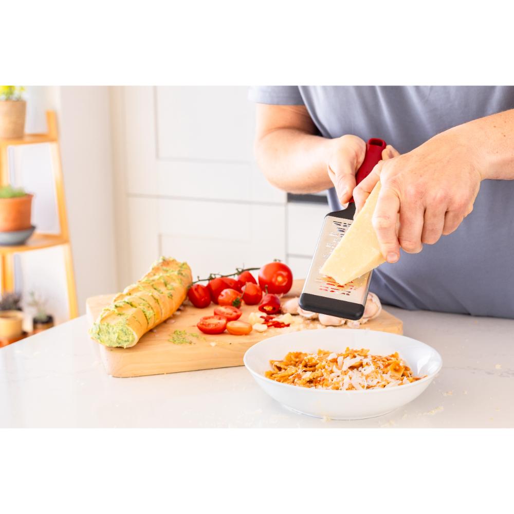 Finished with a bold empire red handle, this essential grater features unique micro-serrations that grate in both directions for faster, more efficient results, perfect for cheese, chocolate, vegetables, and more. The high-quality stainless steel grater head offers strength and precision, while the cushioned non-slip foot provides added stability for grating directly into bowls, onto cutting boards, or over any flat surface. A protective blade cover is included for safe storage when not in use.