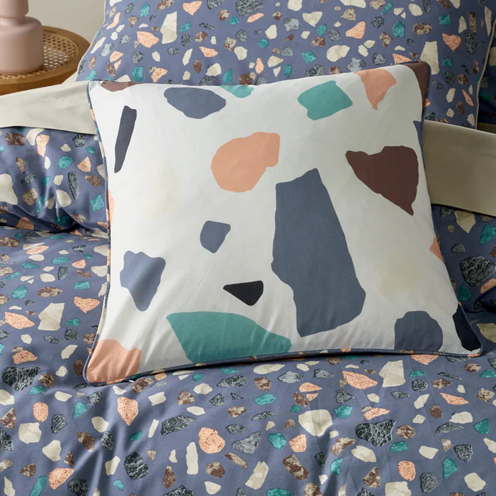 A fun design with an Aztec flavour. Featuring terrazzo patterns of colours that are vibrant against the darker blue background and finished with piping on both the quilt cover and pillowcases, together with piped euros and a striking contrast cushion cover, Gemstone is a great design for people of all ages to enjoy, with a press stud closure and made from 100% cotton. Quilt Cover set includes 2 x Pillowcases.