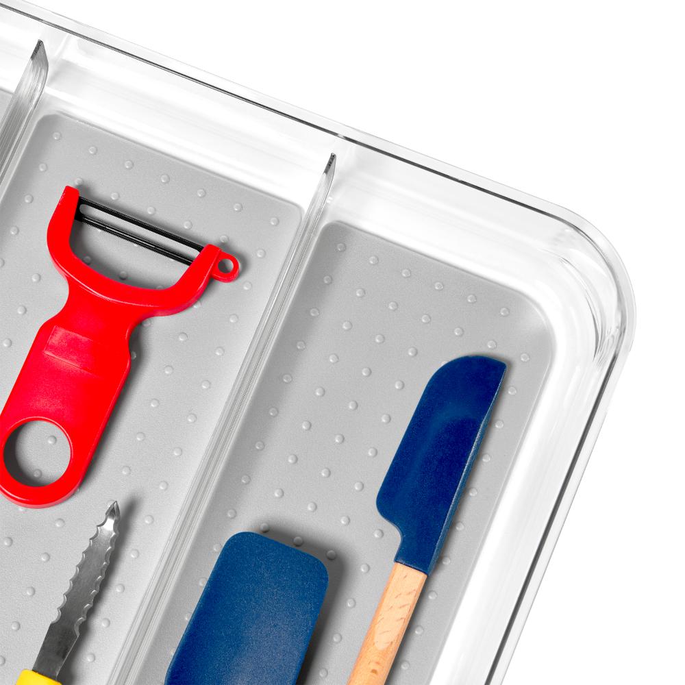 The clear soft grip utensil tray by madesmart® is a modern approach to kitchen drawer organisation. The compact design made for utensils like spatulas, wooden spoons, whisks and more, is created from crystal clear plastic to keep items visible. The soft-grip lining keeps utensils in place and organised, while the rounded corners allow for easy cleaning.