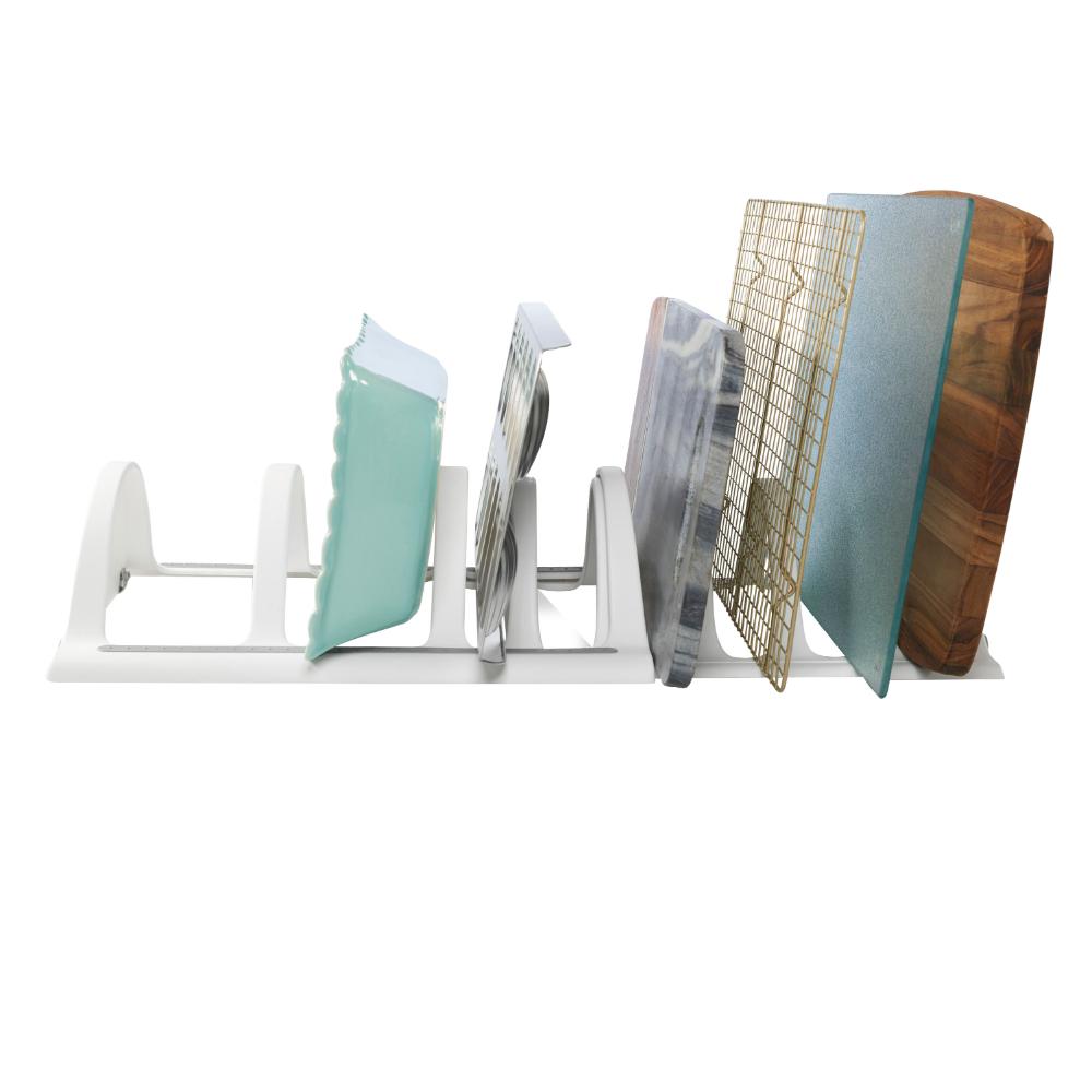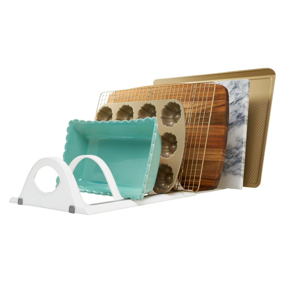 The expandable bakeware organiser by madesmart® is the ideal solution for keeping your bakeware tidy, secure, safe and always within reach. The organiser is perfect for storing bakeware such as trays, cooling racks, cutting boards and even casserole dishes, with the dividers able to be adjusted to create ideal spaces.
