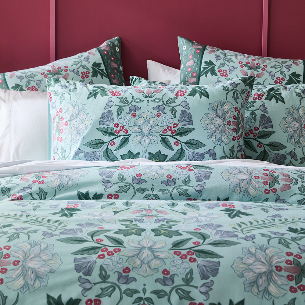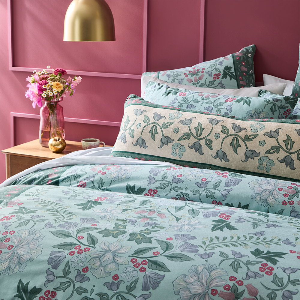 This elegant MyHouse® Aurora Quilt Cover Set features a stunning botanical print in sage and deep green tones on luxurious cotton. The intricate floral design brings natural beauty to your bedroom, while the coordinating European pillowcase (sold separately) completes the look. Perfect for creating a sophisticated, nature-inspired retreat. Style with neutral linens and warm timber accents for a contemporary botanical bedroom aesthetic. Shop MyHouse for more bed linen including coverlets, sheet sets, pillowcases and more.