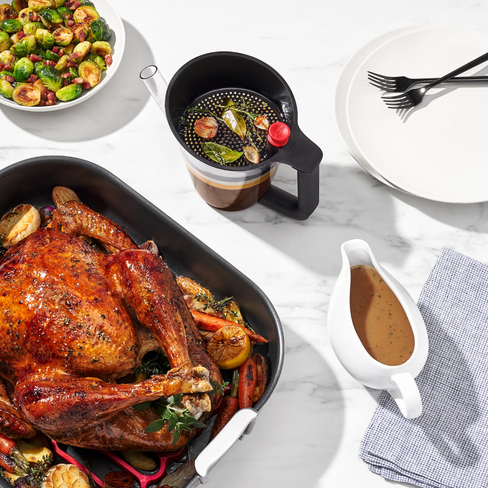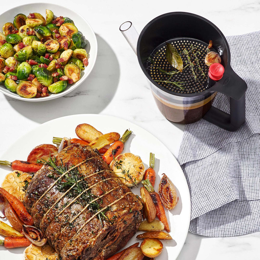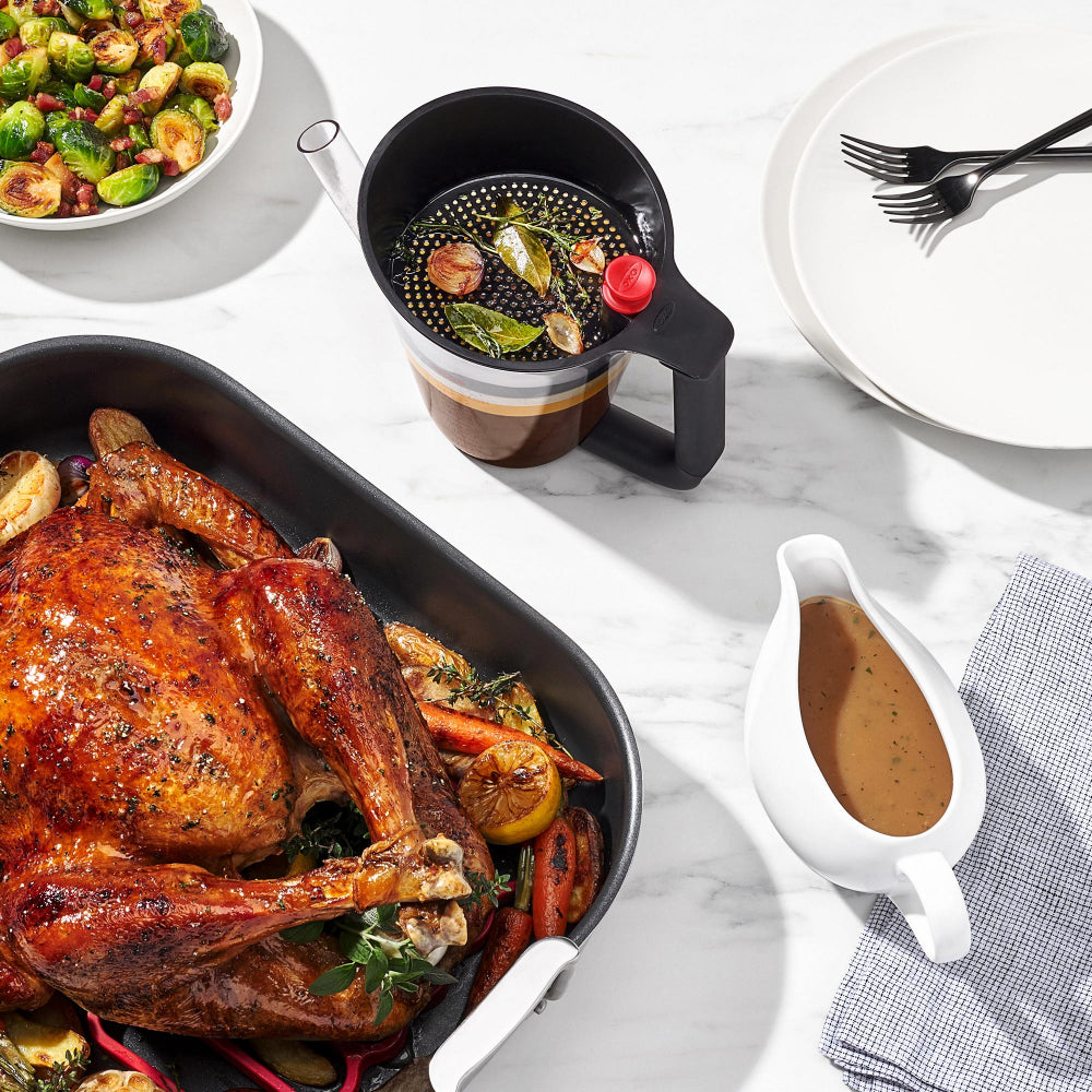 Making gravy has never been easier with the OXO 4 Cup Fat Separator. Simply place the stopper in the spout and when you pour pan drippings into the fat separator, the strainer will separate unwanted bits, and the fat will rise to the top. Remove the stopper and pour, and the flavourful cooking liquid will come out first, allowing you to leave the fat behind. The measurement markings make following recipes simple, and the splatter shield helps prevent splashing while you pour. When you’re done, this Separator is dishwasher safe, and there is a built-in storage spot in the strainer to keep the stopper, so it doesn’t get lost.