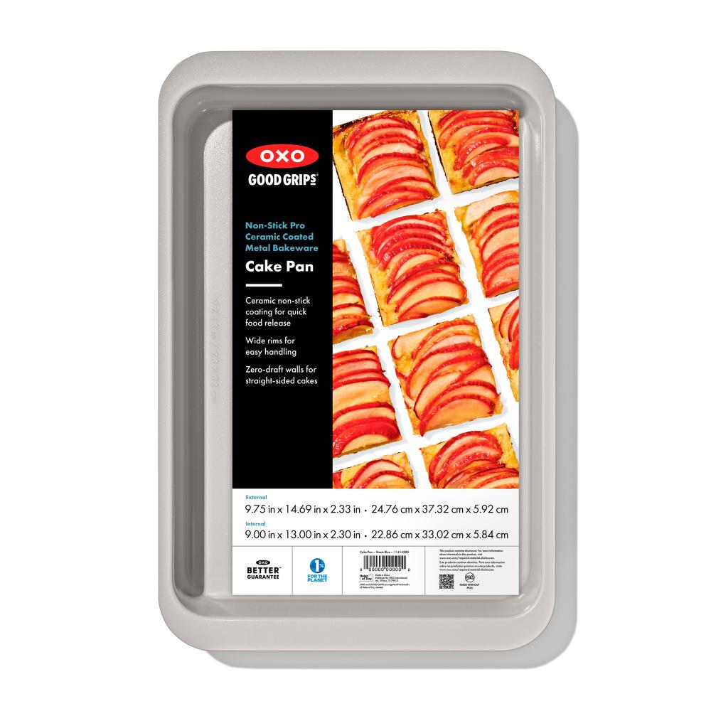 The OXO Good Grips Non-Stick Pro Ceramic Coated Metal Bakeware 9-in x 13-in (22.86cm x 33.02cm) Cake Pan is a bakeware solution that's beautiful, durable and easy to clean. This cake pan is ideal for tray cakes, and the zero-draft walls allow for straight and uniform cake layers. The efficient ceramic non-stick coating heats quickly and evenly, allows for easy food release and protects against scratching, staining, corrosion and abrasion. Get consistent results - the light interior coating colour has been optimized for even browning for both sweet and savory baking. The bakeware is constructed from heavy-gauge aluminized steel for stability, even heat distribution and durability for years to come. The square-rolled edge adds structure and strength to the bakeware, and the wide rims provide a secure grip for easier handling in and around the oven. Each pan features pan dimension markings on the top surface, so you can find the right bakeware item for your recipe Rounded interior corners allow for easier cleaning. Hand wash for best results.