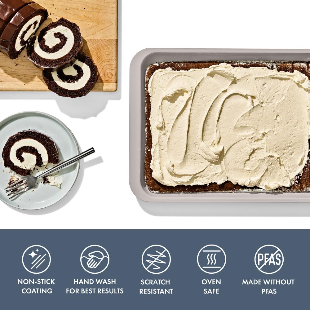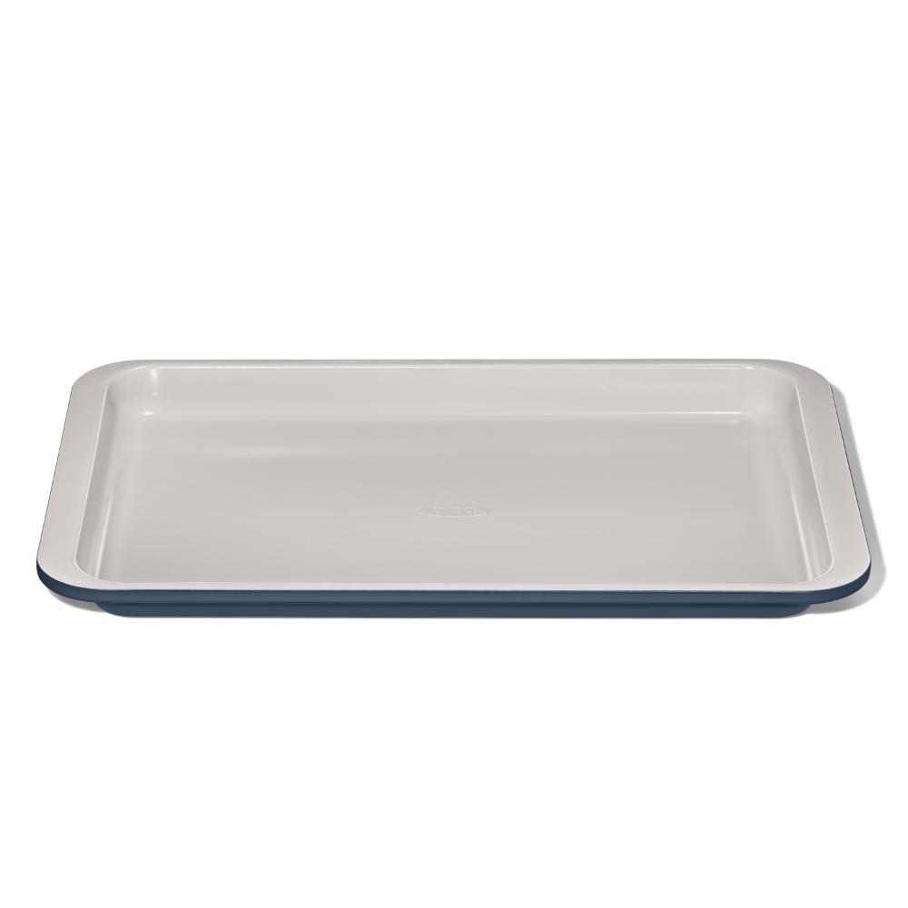 The OXO Good Grips Non-Stick Pro Ceramic Coated Metal Bakeware Jelly Roll Pan is a bakeware solution that's beautiful, durable and easy to clean. The jelly roll pan provides versatility for baking and roasting. The jelly roll pan is ideal for your rolled cakes or small bakes. The efficient ceramic non-stick coating heats quickly and evenly, allows for easy food release and protects against scratching, staining, corrosion and abrasion. Get consistent results - the light interior coating colour has been optimized for even browning for both sweet and savory baking. The bakeware is constructed from heavy-gauge aluminized steel for stability, even heat distribution and durability for years to come. The square-rolled edge adds structure and strength to the bakeware, and the wide rims provide a secure grip for easier handling in and around the oven. Each pan features pan dimension markings on the top surface, so you can find the right bakeware item for your recipe. Zero-draft walls on our cake pans allow for straight and uniform cake layers. Rounded interior corners allow for easier cleaning. Hand wash for best results.