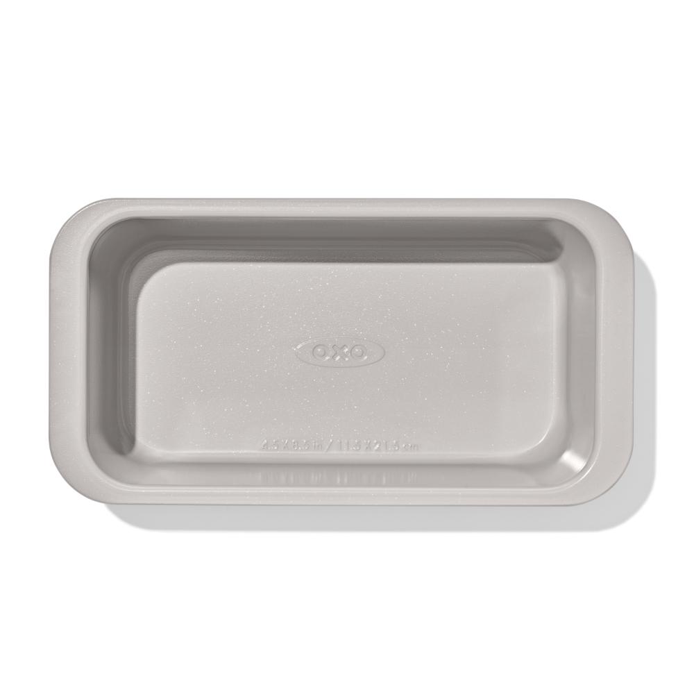 The OXO Good Grips Non-Stick Pro Ceramic Coated Metal Bakeware 1 lb (450g) Loaf Pan is a bakeware solution that's beautiful, durable and easy to clean. This loaf pan provides versatility for baking and is perfect for homemade sandwich bread or an apple loaf. The efficient ceramic non-stick coating heats quickly and evenly, allows for easy food release and protects against scratching, staining, corrosion and abrasion. Get consistent results - the light interior coating colour has been optimized for even browning for both sweet and savory baking. The bakeware is constructed from heavy-gauge aluminized steel for stability, even heat distribution and durability for years to come. The square-rolled edge adds structure and strength to the bakeware, and the wide rims provide a secure grip for easier handling in and around the oven. Each pan features pan dimension markings on the top surface, so you can find the right bakeware item for your recipe. Zero-draft walls on our cake pans allow for straight and uniform cake layers. Rounded interior corners allow for easier cleaning. Hand wash for best results.