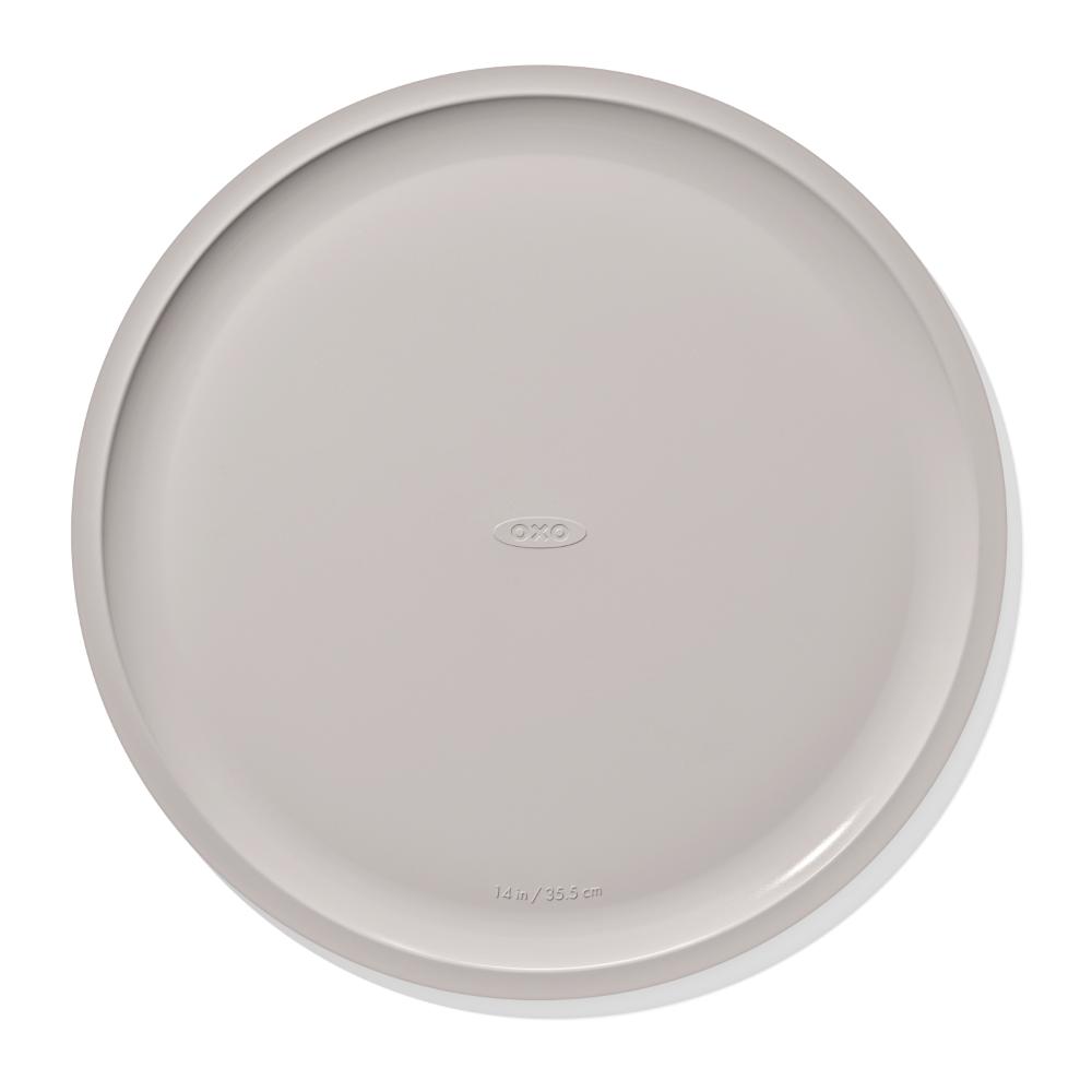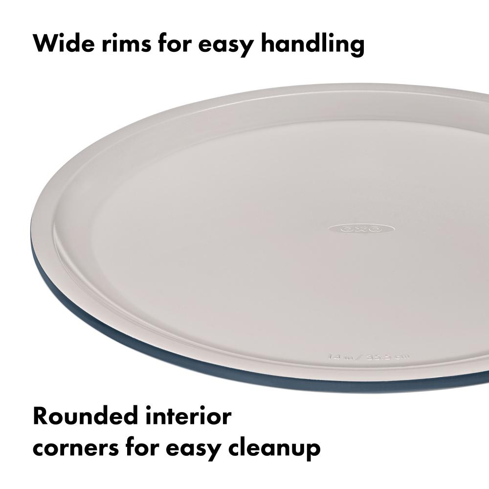 The OXO Good Grips Non-Stick Pro Ceramic Coated Metal Bakeware 14- in Pizza Pan is a bakeware solution that's beautiful, durable and easy to clean. This pizza pan is perfect for oven-baked pizza or apple tarts. The efficient ceramic non-stick coating heats quickly and evenly, allows for easy food release and protects against scratching, staining, corrosion and abrasion. Get consistent results - the light interior coating colour has been optimized for even browning for both sweet and savory baking. The bakeware is constructed from heavy-gauge aluminized steel for stability, even heat distribution and durability for years to come. The square-rolled edge adds structure and strength to the bakeware, and the wide rims provide a secure grip for easier handling in and around the oven. Each pan features pan dimension markings on the top surface, so you can find the right bakeware item for your recipe. Zero-draft walls on our cake pans allow for straight and uniform cake layers. Rounded interior corners allow for easier cleaning. Hand wash for best results.
