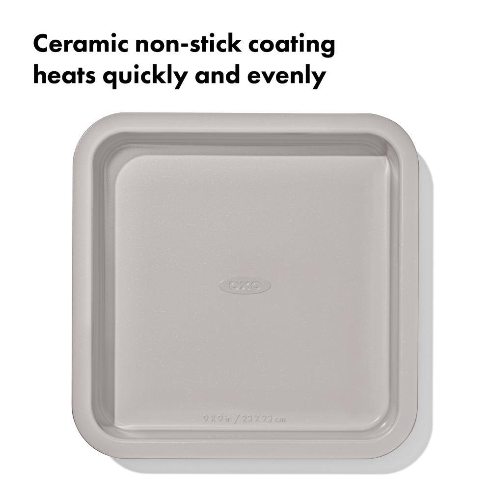 The OXO Good Grips Non-Stick Pro Ceramic Coated Metal Bakeware 9-in (22.86cm) Square Cake Pan is a bakeware solution that's beautiful, durable and easy to clean. This square pan is ideal for layered cakes, and the zero-draft walls allow for straight and uniform cake layers. The efficient ceramic non-stick coating heats quickly and evenly, allows for easy food release and protects against scratching, staining, corrosion and abrasion. Get consistent results - the light interior coating colour has been optimized for even browning for both sweet and savory baking. The bakeware is constructed from heavy-gauge aluminized steel for stability, even heat distribution and durability for years to come. The square-rolled edge adds structure and strength to the bakeware, and the wide rims provide a secure grip for easier handling in and around the oven. Each pan features pan dimension markings on the top surface, so you can find the right bakeware item for your recipe Rounded interior corners allow for easier cleaning. Hand wash for best results.