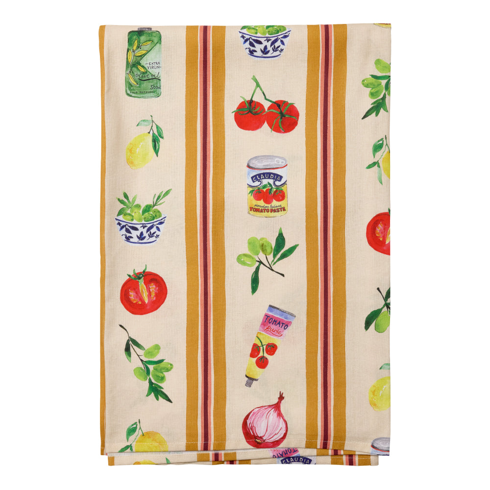 • The hand-painted artwork in striking reds, lush greens and vibrant yellows are displayed atop tiled and striped backgrounds in a welcoming palette of sage green and earthy saffron• The Valentina napery collection features apron and oven gloves, as well as table cloth, napkins and tea towels