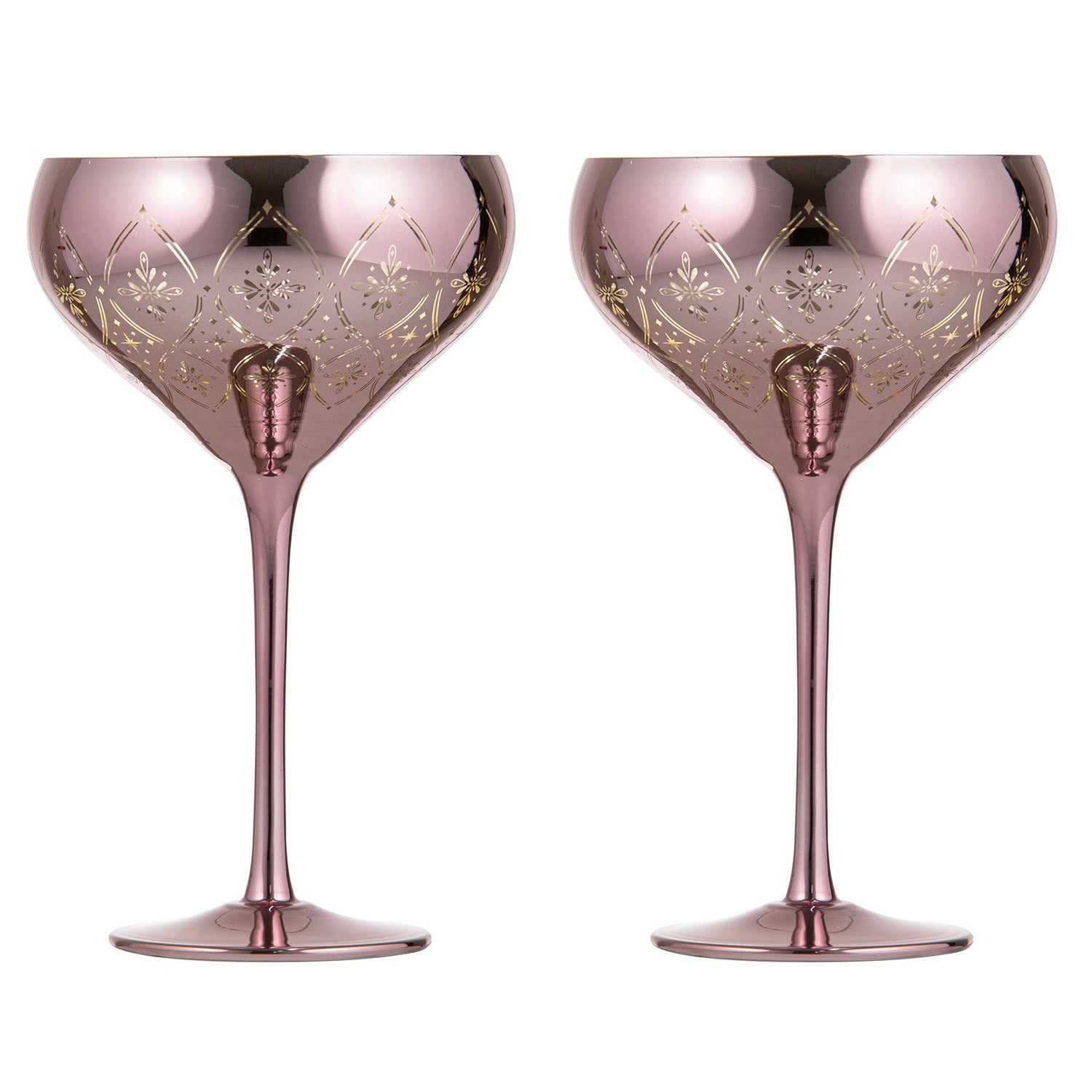The Tempa Chantelle 2 Piece Cocktail Glass Set showcases timeless glassware shapes adorned with a refined touch of elegance. Each piece boasts a delicate laser-etched design, allowing the internal electroplated gold to radiantly shine through.