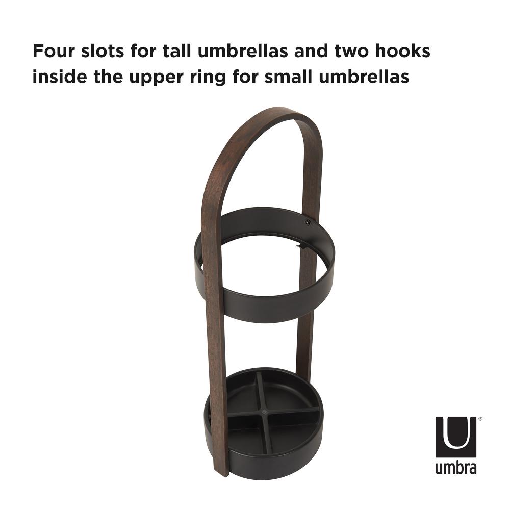 The Bellwood Umbrella Stand is durable as it is stylish thanks to its beautiful and shape and resin base, which is water-resistant and prevents rusting. Featuring a round base and a curved wood veneer handle with an upper ring made of steel. This piece is easy to assemble and includes all hardware. Its slots will hold your tall umbrellas with ease and its tiny hooks on the top of the ring will hold your more compact, short umbrellas.