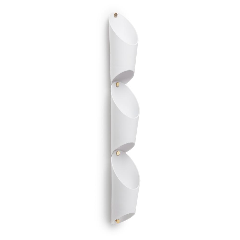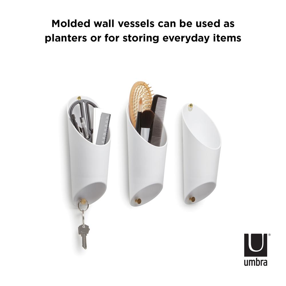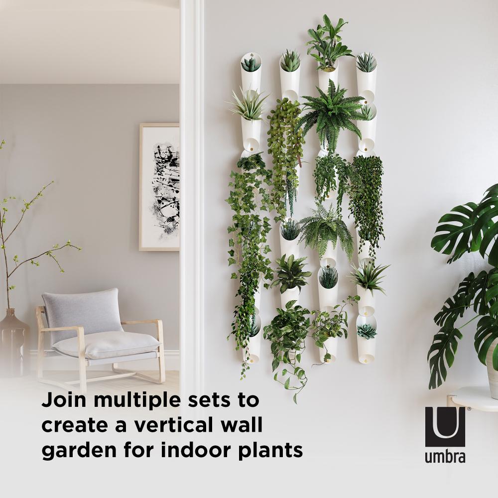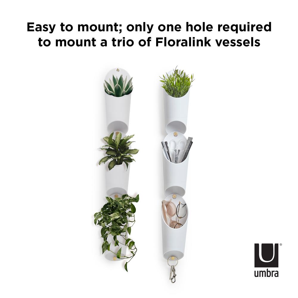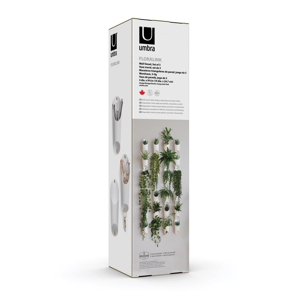 Umbra Floralink is a set of three wall vessels that link together and hold indoors plants like succulents. Combine and link multiple sets together to create a live garden on your wall. These pretty molded vessels have a shape inspired by organ pipes and can be used to hold items aside from plants, making them a compact open storage item, great for small spaces. Easy to mount, these vessels include all hanging hardware and each set of three only requires one hole in the wall to be hung up.