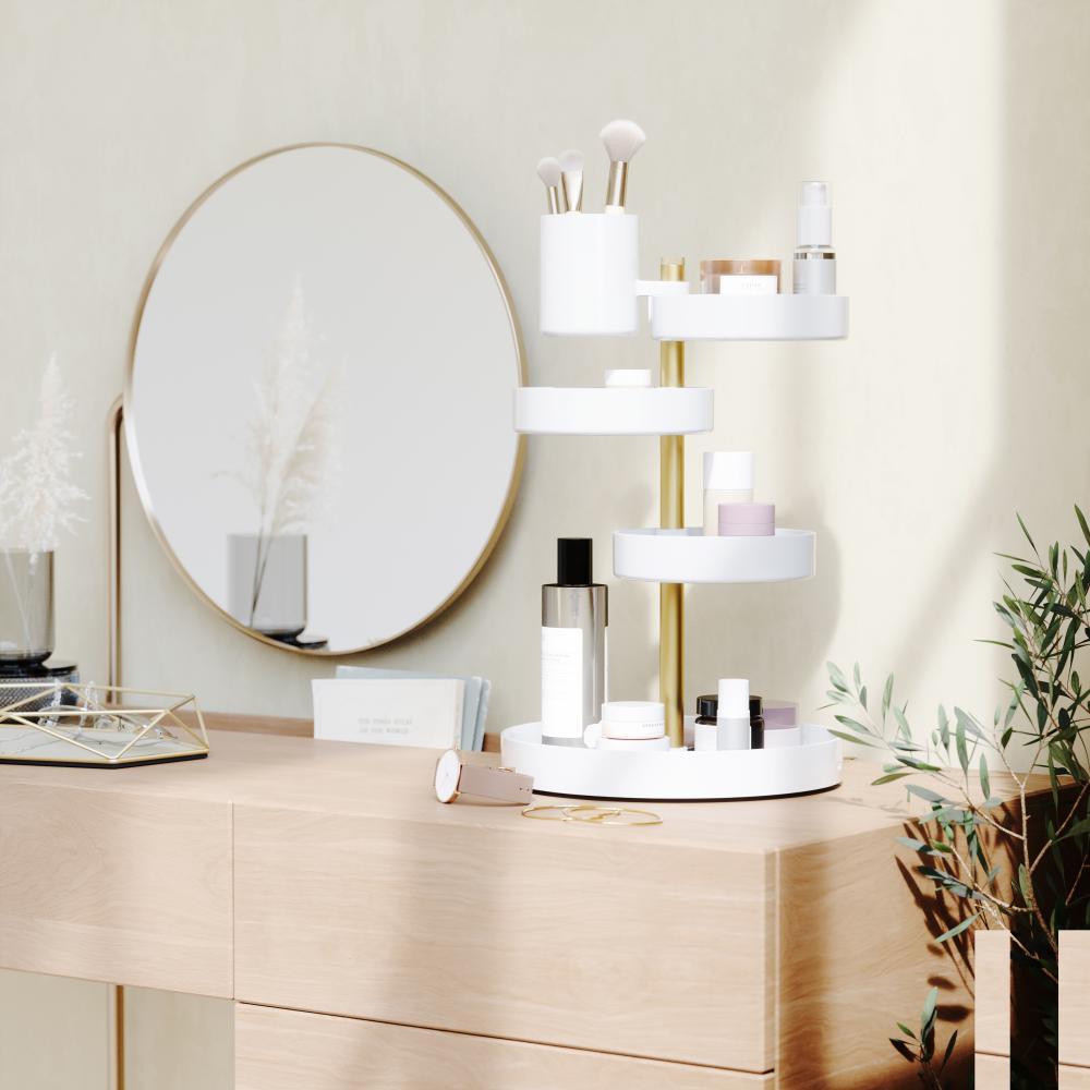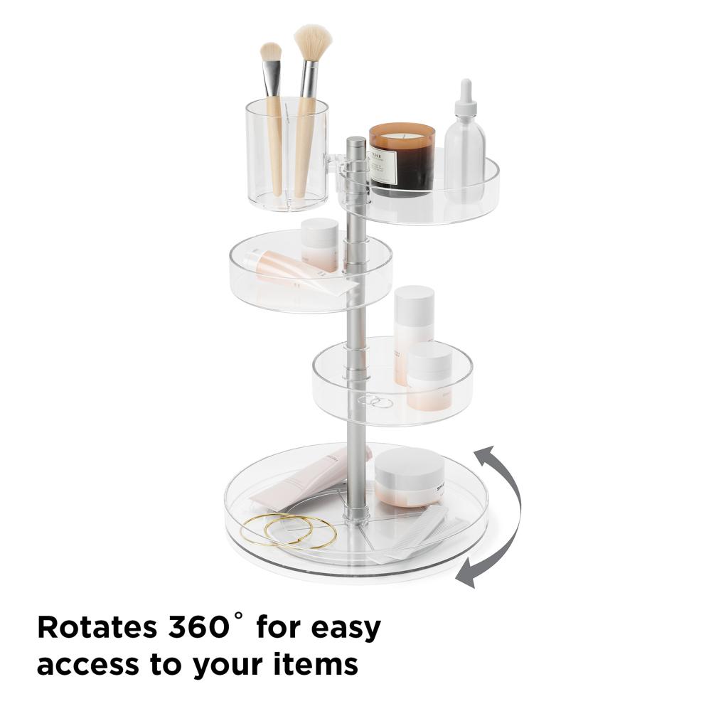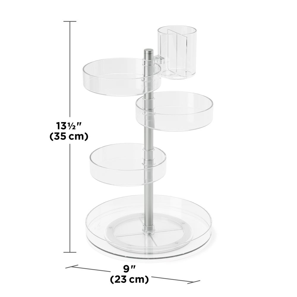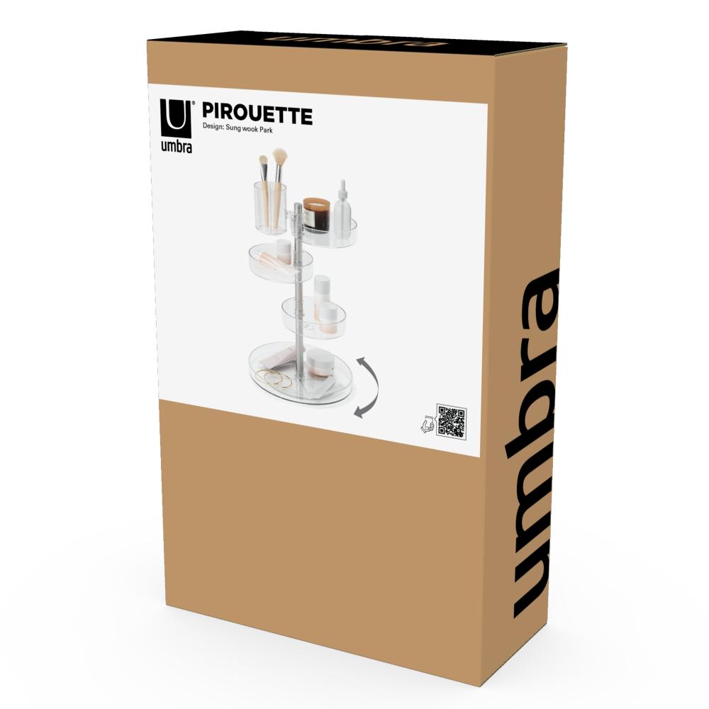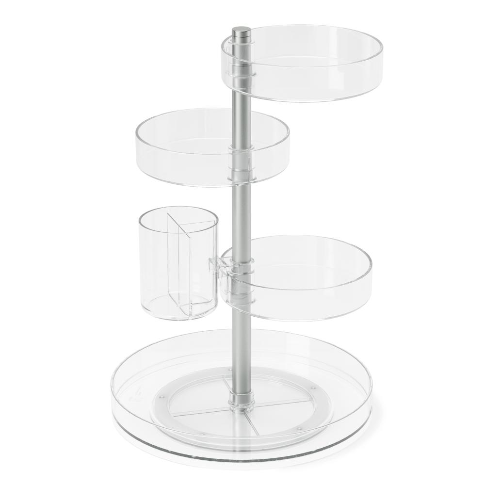 De-clutter and organize your everyday essentials with Umbra Pirouette. This cosmetic organizer features multiple compartments that rotate 360-degrees with ease. Pirouette has a large capacity but a small footprint, making it easy to display on any countertop or vanity. Each layer's placement can be customized and locked into place for varying sized products.