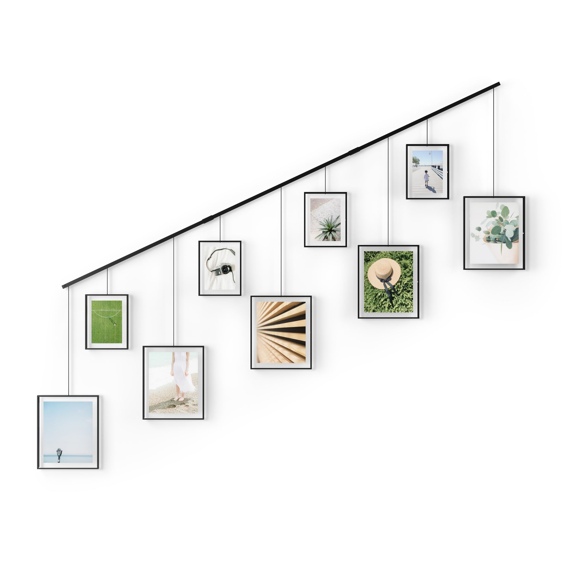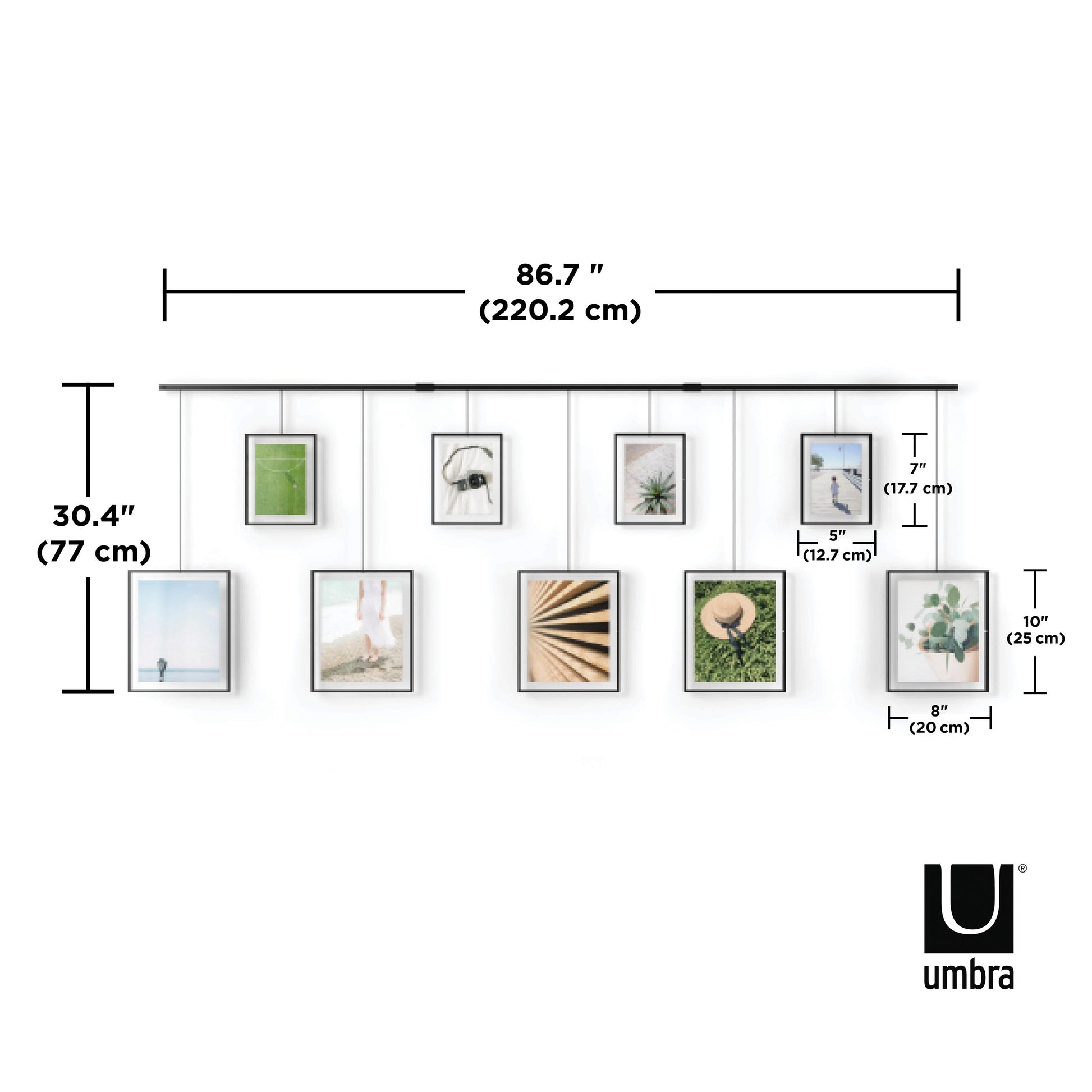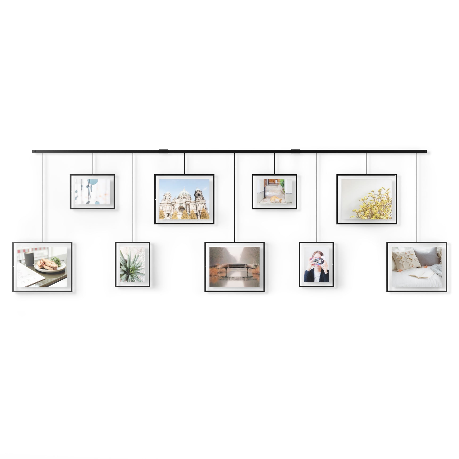• Display your favourite photos in an eye-catching fashion using these nine hanging, gallery-style frames suspended from a modern and sleek beam• Each picture frame can be moved around the included metal beam, while the hanging rods can be interchanged to create multiple configurations to best fit your space
