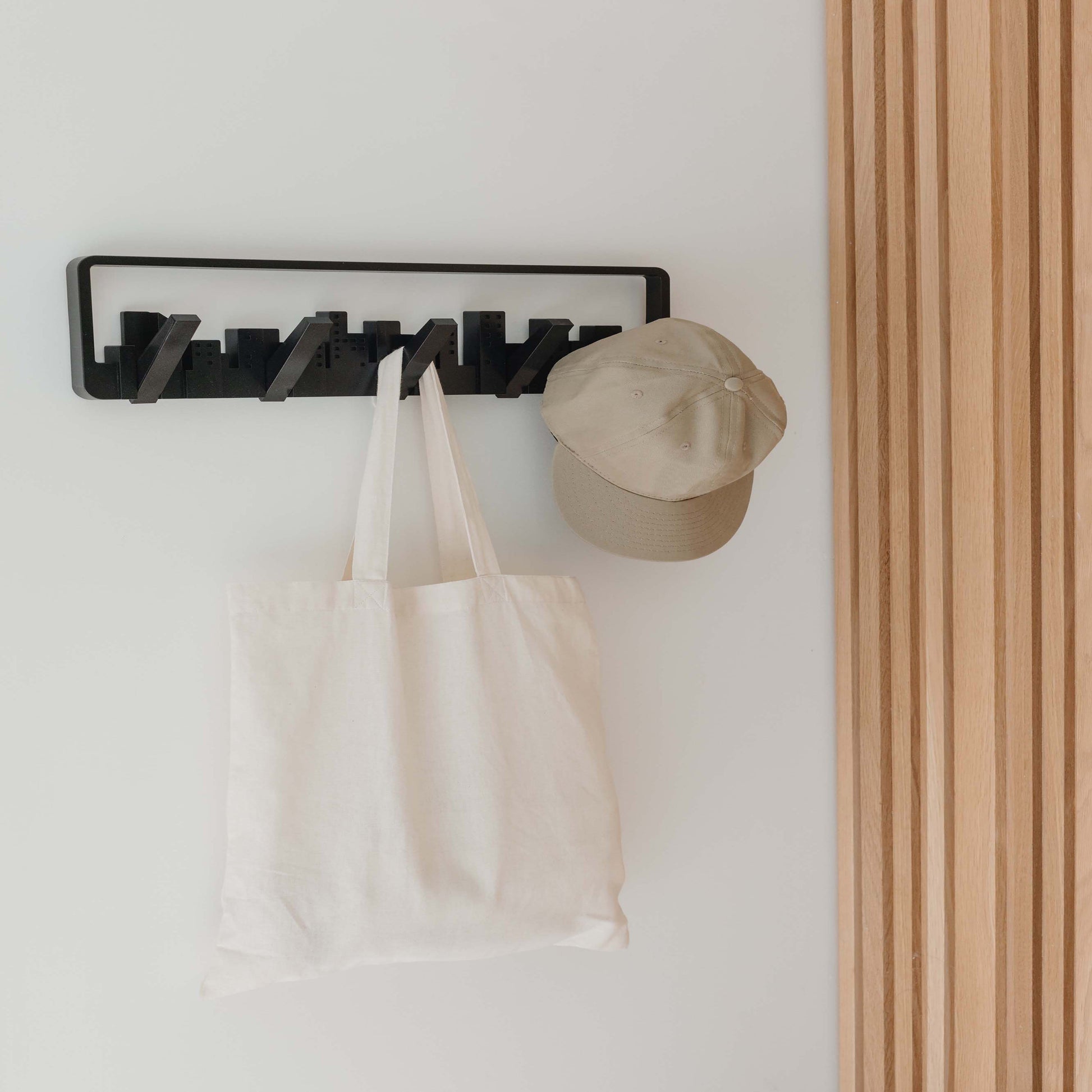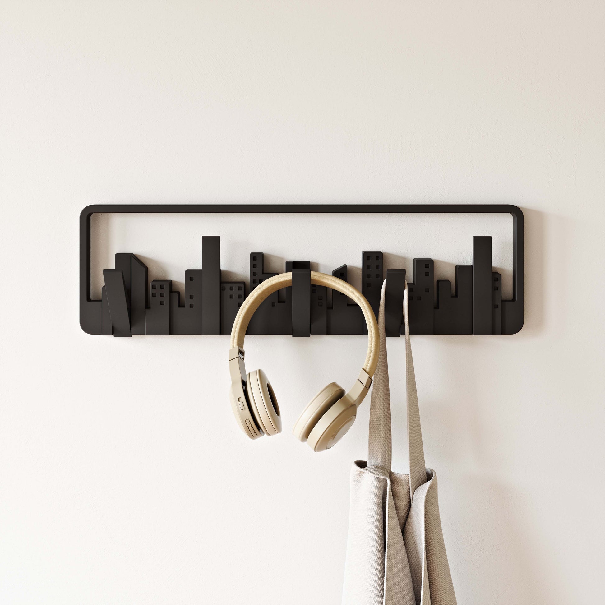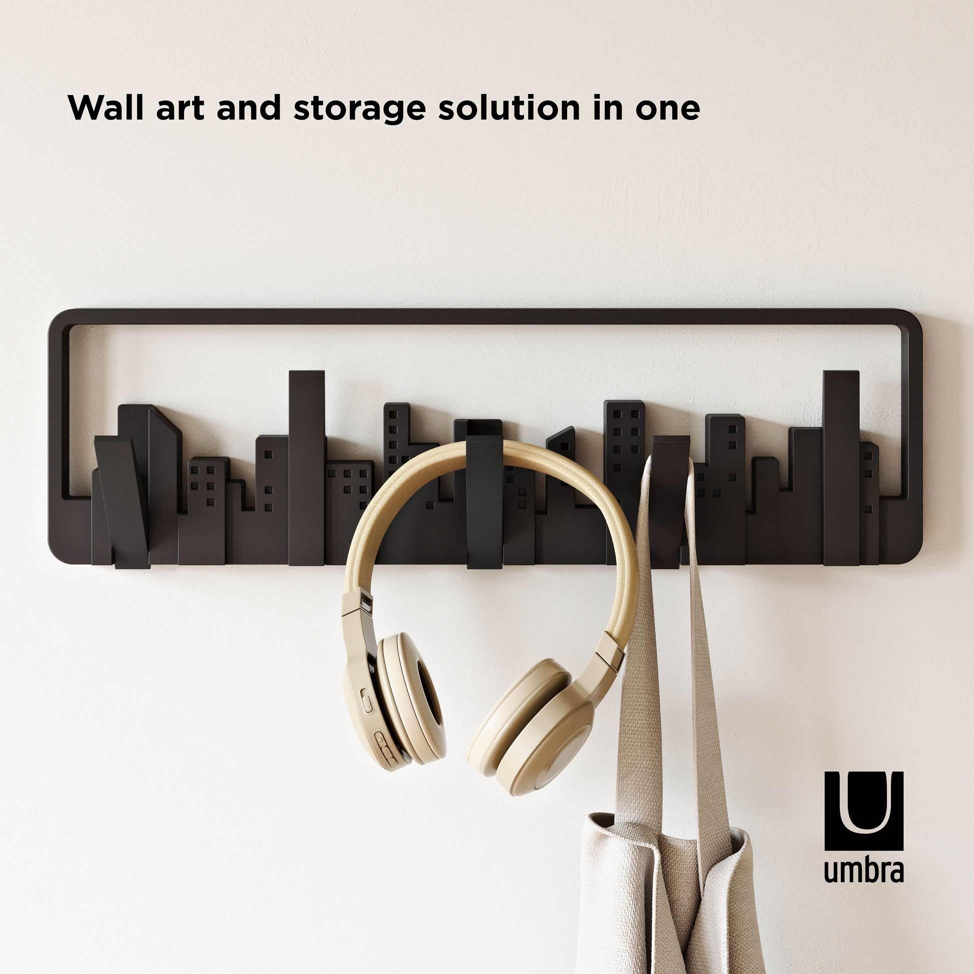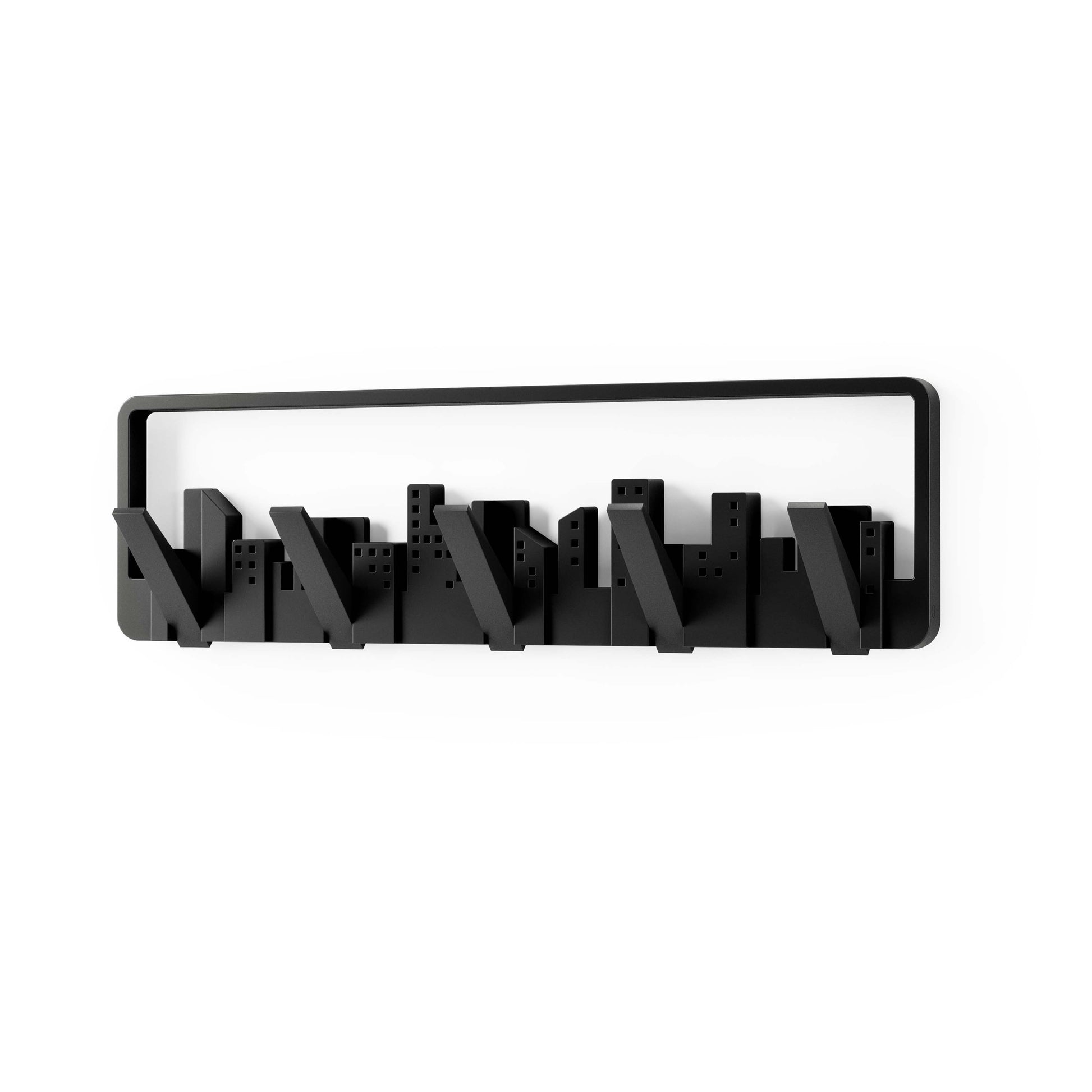 The Umbra Skyline Multi Hook is a piece of wall art that unexpectedly transforms into a collection of hooks that can be used for hanging scarves, accessories, bags and coats.