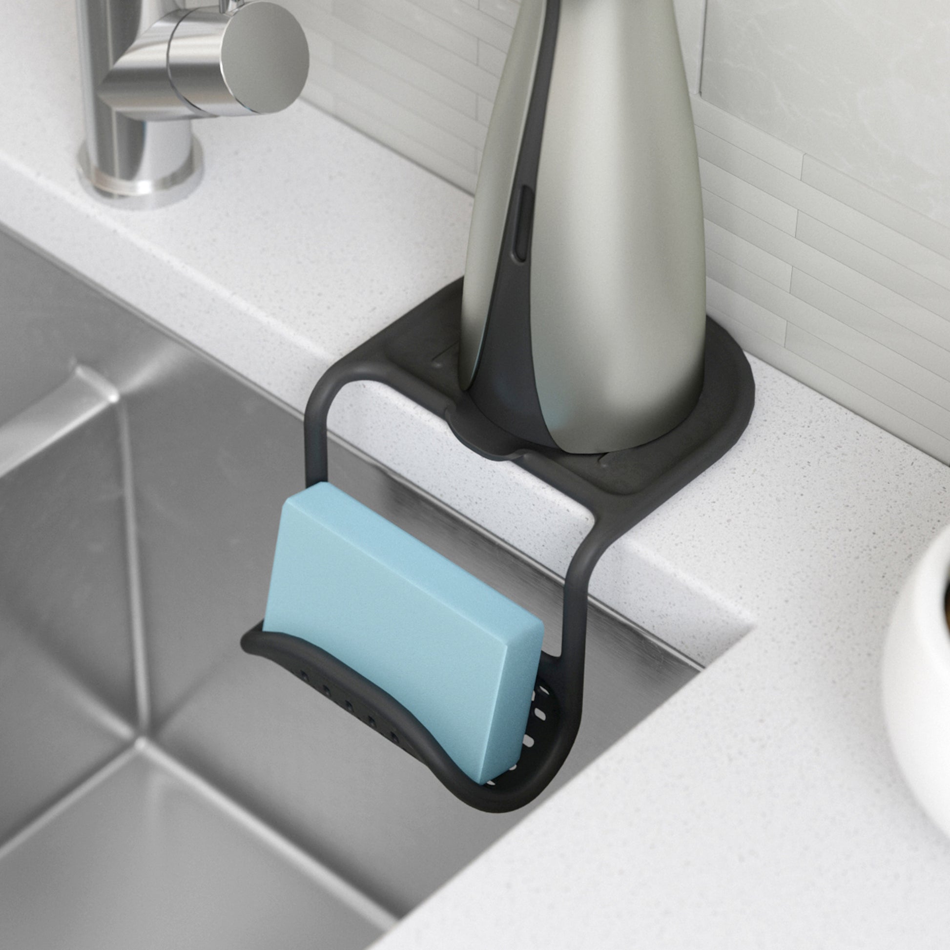 • Store your sponges, scrubber and other cleaning tools efficiently in this Sling Flexible Double Sink Caddy• The easy to bend feature means it can fit in any sink wall or tap