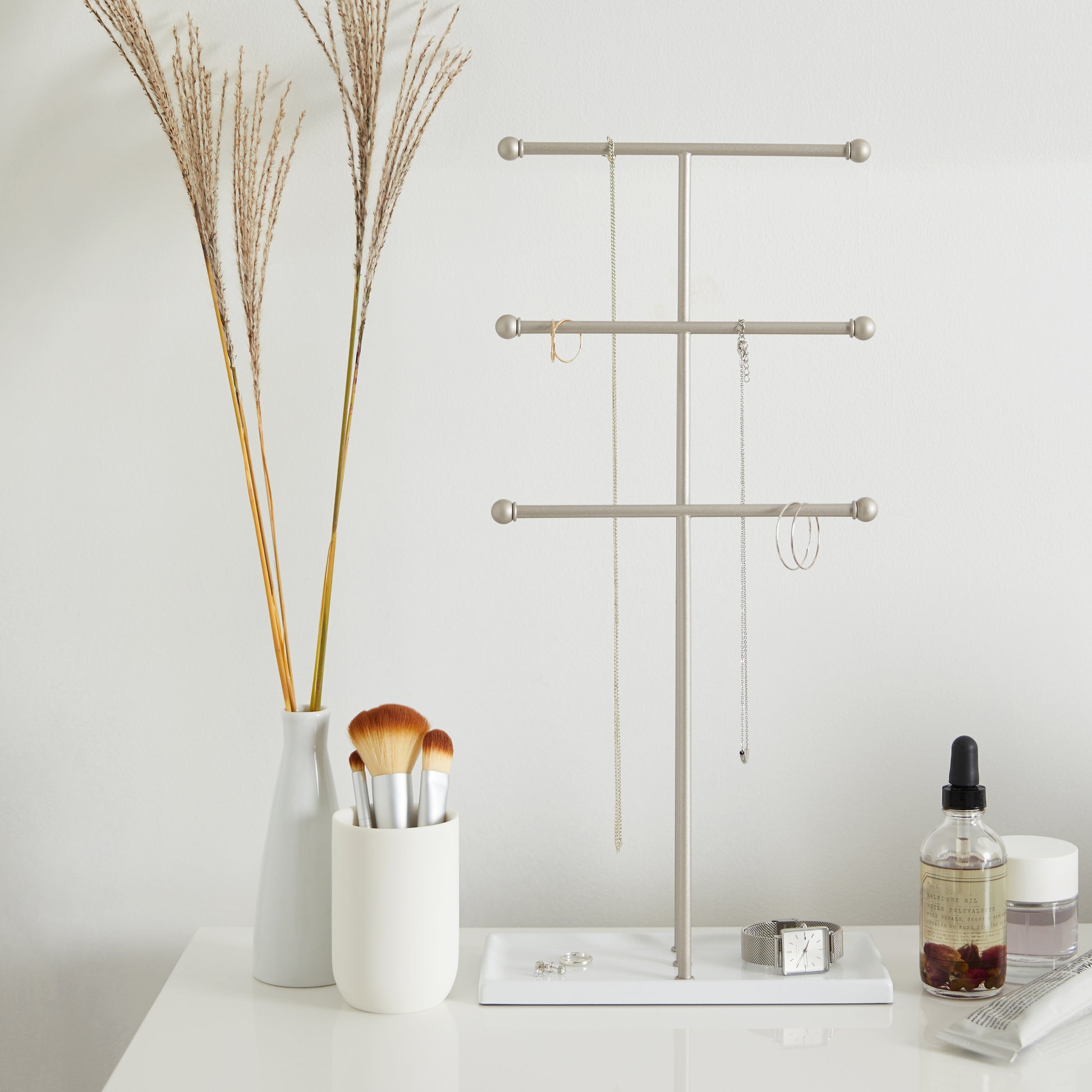 Keep jewellery organized and beautifully displayed with the Umbra Trigem White Jewellery Stand. This white and nickel metal stand provides stylish storage for necklaces, bracelets, and earrings.