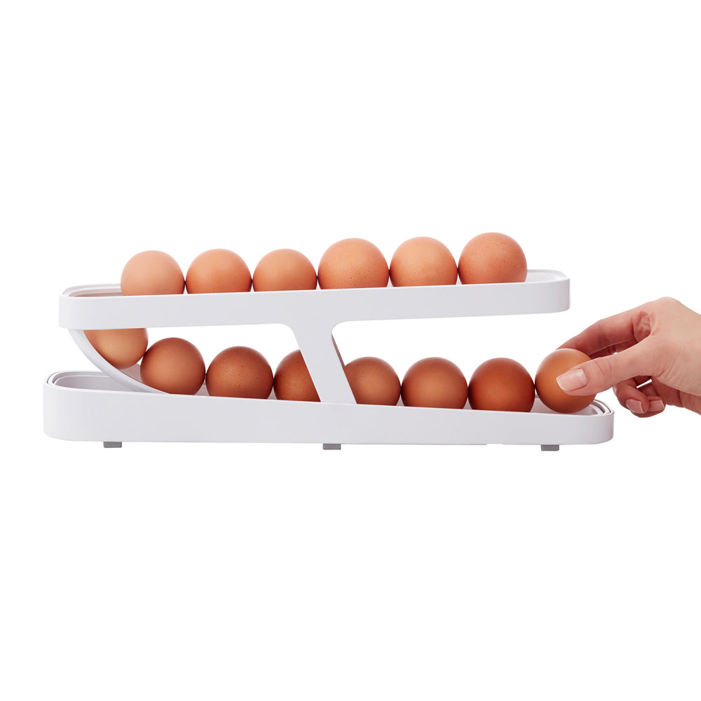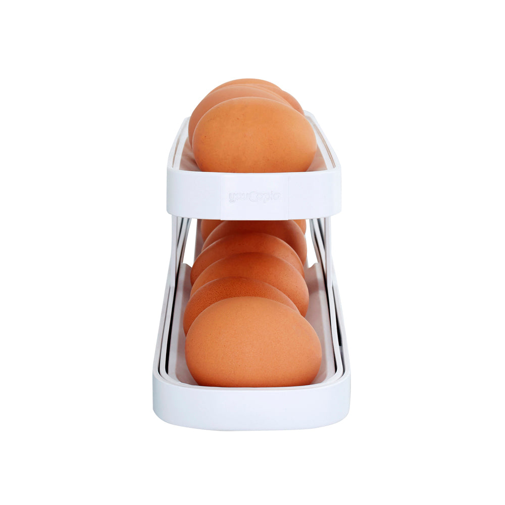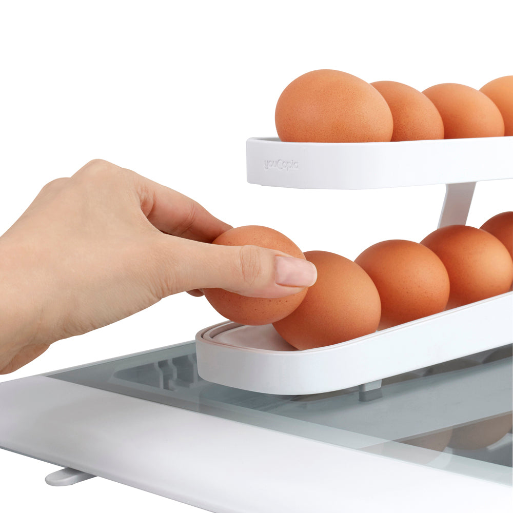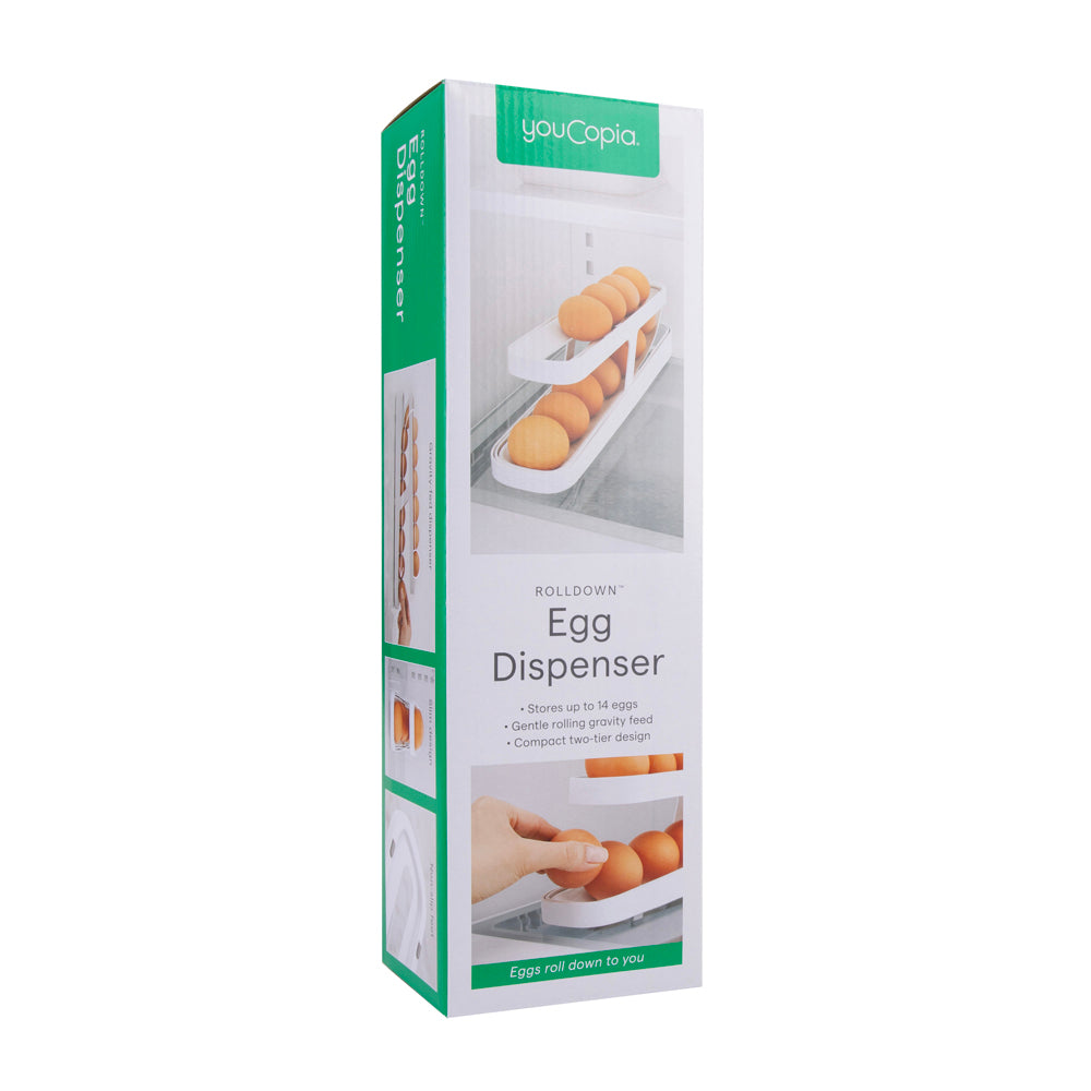 Store your eggs in style with the innovative YouCopia RollDown Egg Dispenser - a sleek solution for accessible and organised refrigeration. Designed to accommodate standard, large, and jumbo eggs, this dispenser holds 12 to 14 eggs in a space-saving two-tiered configuration. The gravity-fed track ensures a seamless experience – as you take one egg, the others gracefully roll down to take its place. Non-slip feet keep it securely in your fridge, making breakfast prep a breeze while optimising valuable space. Experience the perfect blend of style and functionality with the YouCopia RollDown Egg Dispenser.