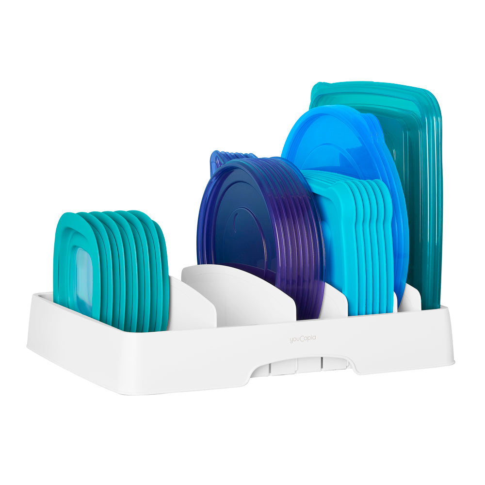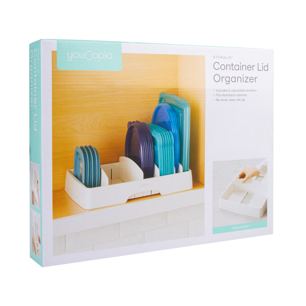 Say goodbye to lid chaos with the YouCopia StoraLid Container Lid Organiser Large. Tame the unruly tangle of container lids in your kitchen cupboard or drawer effortlessly. Crafted from plastic, it boasts five adjustable dividers, allowing you to categorise lids by size and shape. Accommodating both round and square lids up to 23cm, this organiser ensures a tidy storage solution. With built-in handles for easy lifting and transport, reclaim your kitchen space and bid farewell to lid confusion. Bring order to your kitchen with the YouCopia StoraLid Container Lid Organiser Large.