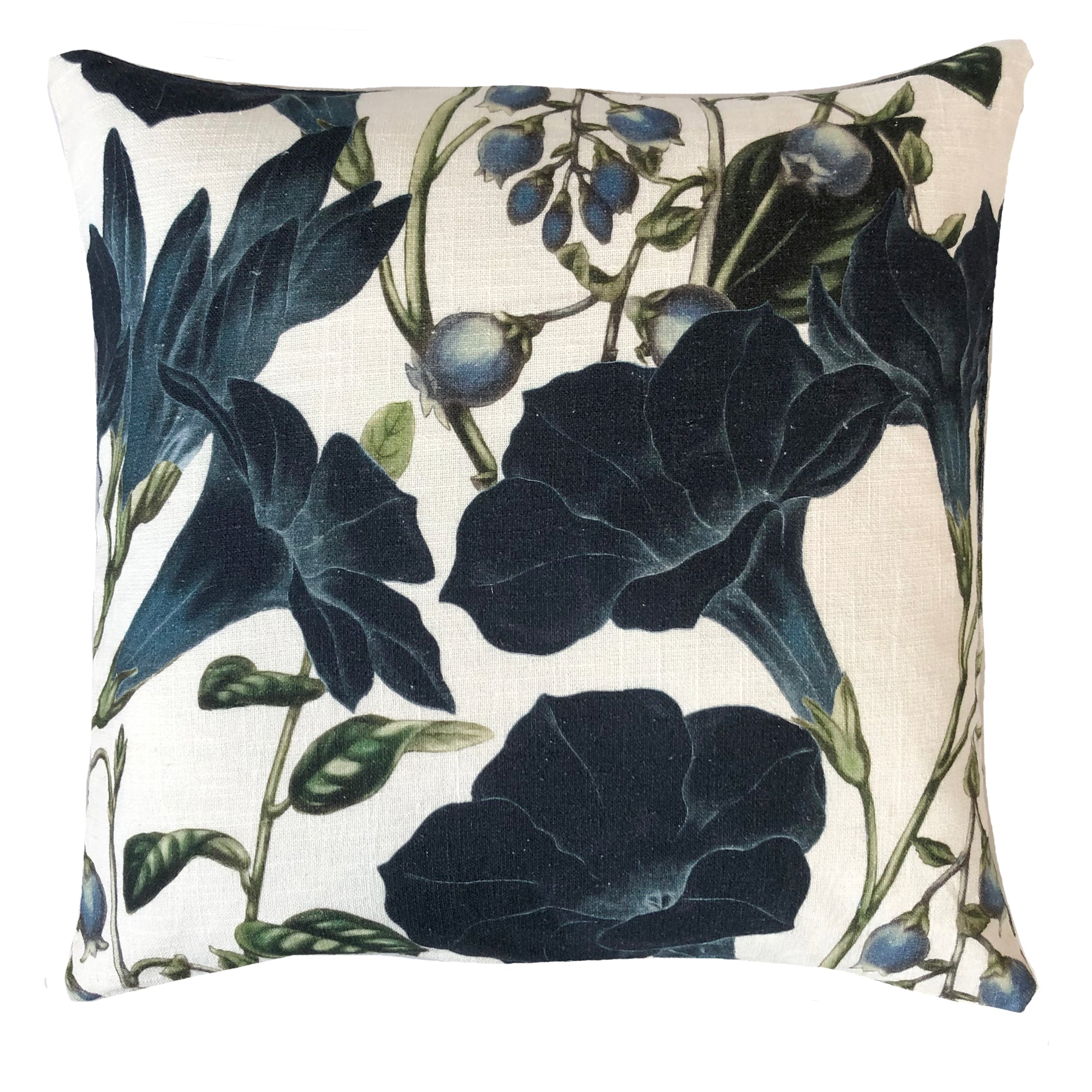 The Lilith Navy cushion is a striking blend of elegance and artistry. Made from 100% cotton slub fabric, it offers a subtle texture that enhances its sophisticated design. This double-sided cushion features a vibrant digital print of navy trumpet lilies set against a neutral background. Perfect for adding a touch of botanical charm to any decor.