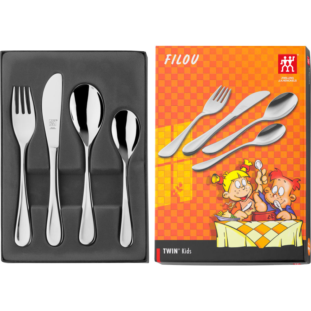 A good grip for safe use. The Zwilling Filou 4 Piece Kids Flatware Set is made of high-quality stainless steel is perfect for helping children who want to learn how to eat by themselves. The flatware pieces are ergonomically designed so that even small children aged three and over can use them safely.