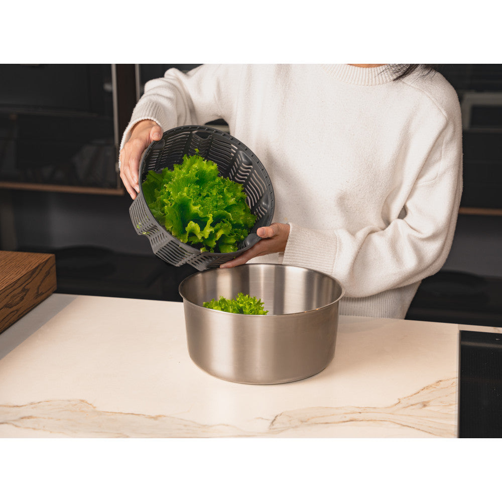 The Zyliss Easy Spin Stainless Steel Salad Spinner is designed to make salad prep a breeze. Whether quickly drying greens for a light lunch or preparing veggies for a hearty dinner, this spinner effortlessly removes excess water in seconds—leaving you with perfectly crisp, fresh ingredients every time. Its thoughtful design allows you to easily pour off the water without making a mess, while the foldable handle ensures it stores away neatly in your kitchen. The stainless steel bowl doubles as a serving dish.