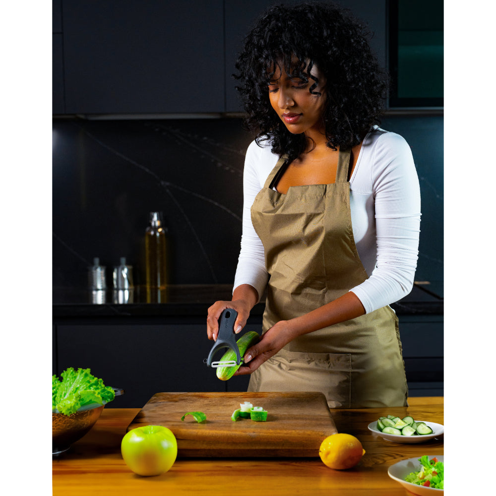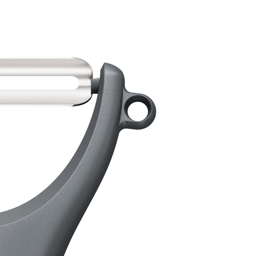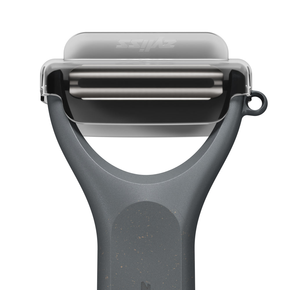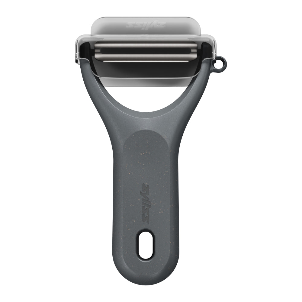 The Zyliss Y Peeler features a sharp, stainless steel blade glides through even the toughest of fruit and vegetable skins with ease. The ergonomic handle is suitable for any hand size. The peeler features a blade cover for safer storage. and an eye cutter tool to removes blemishes. The ergonomic eco handle is made from up to 50% wheat straw material.